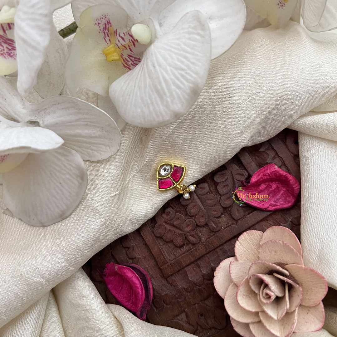 The Vriksham Antique Jadau Kundan Nath in red and white exudes timeless elegance with its classic design and meticulous craftsmanship. Featuring traditional Jadau and Kundan techniques, this piece offers a graceful blend of antique charm and refined sophistication, perfect for enhancing your special occasion ensemble.