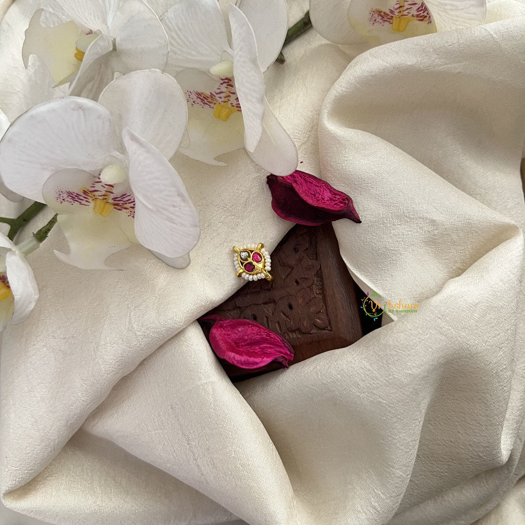 Indulge in luxury and elegance with the Vriksham Antique Jadau Kundan Nath. Adorned with intricate red and white pearls, this exquisite piece adds a touch of sophistication to any outfit. Embrace the art of fashion with this timeless accessory.