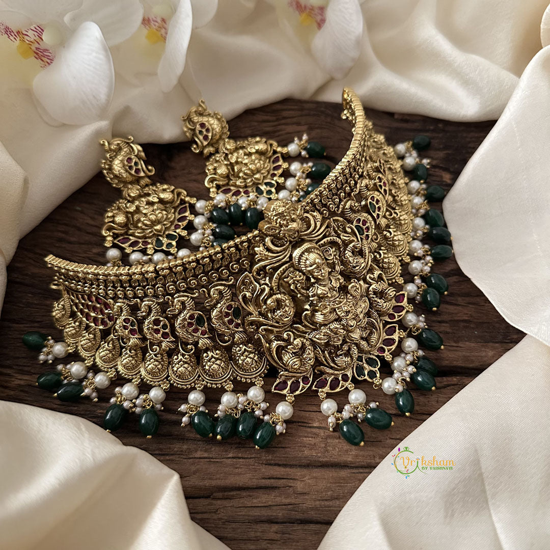 This exquisite Vriksham Antique Lakshmi High Neck Choker boasts stunning peacock embellishments and a luxurious green bead. Channeling the grace and beauty of the goddess Lakshmi, this piece is a must-have for those seeking elevated elegance and sophistication. Elevate your look with this premium choker.