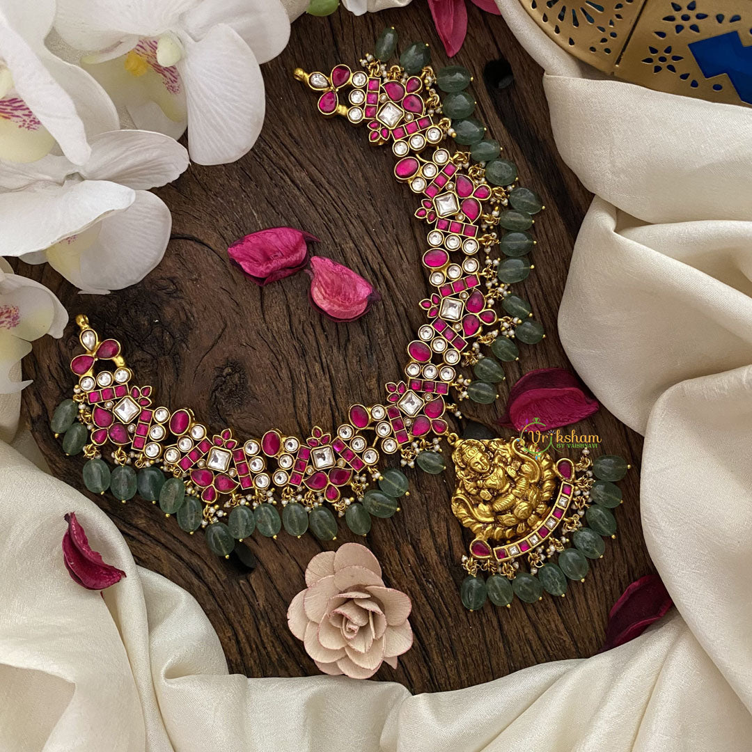 Indulge in luxury with Vriksham's Antique Lakshmi Pendant Kundan Jadau Neckpiece. Made with pastel green beads, this exquisite piece is adorned with a vintage-inspired Lakshmi pendant, crafted with traditional Kundan Jadau techniques. Elevate your style and evoke a sense of opulence with this one-of-a-kind piece.