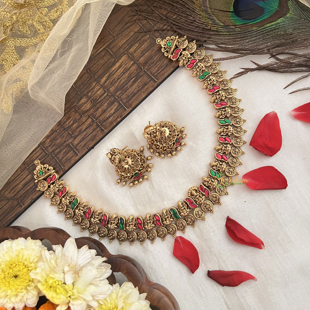 The Vriksham Antique Lakshmi Short Neckpiece in Red and Green showcases exquisite floral coin detailing, blending vibrant hues with traditional design. This sophisticated accessory adds a regal touch to any outfit, perfect for enhancing your look with cultural elegance and timeless beauty.