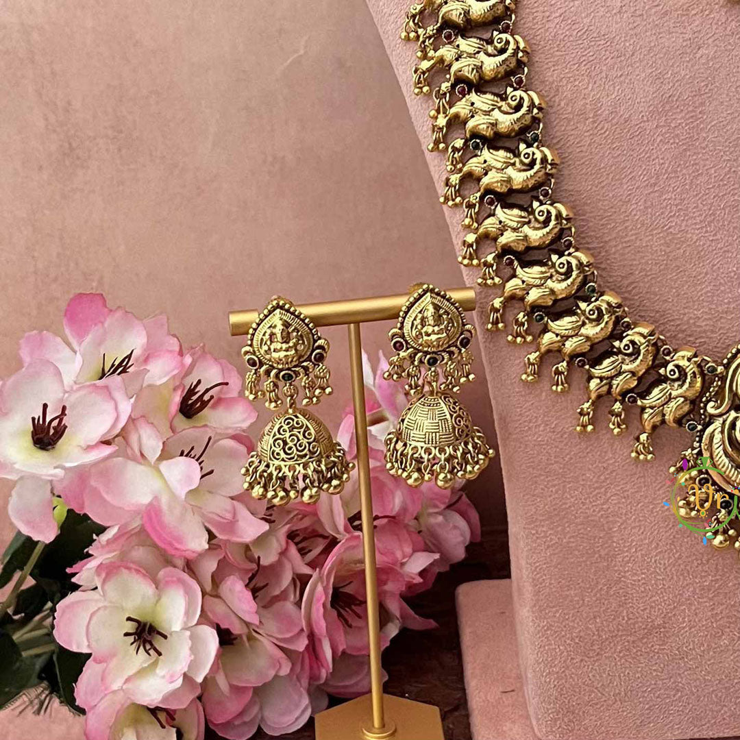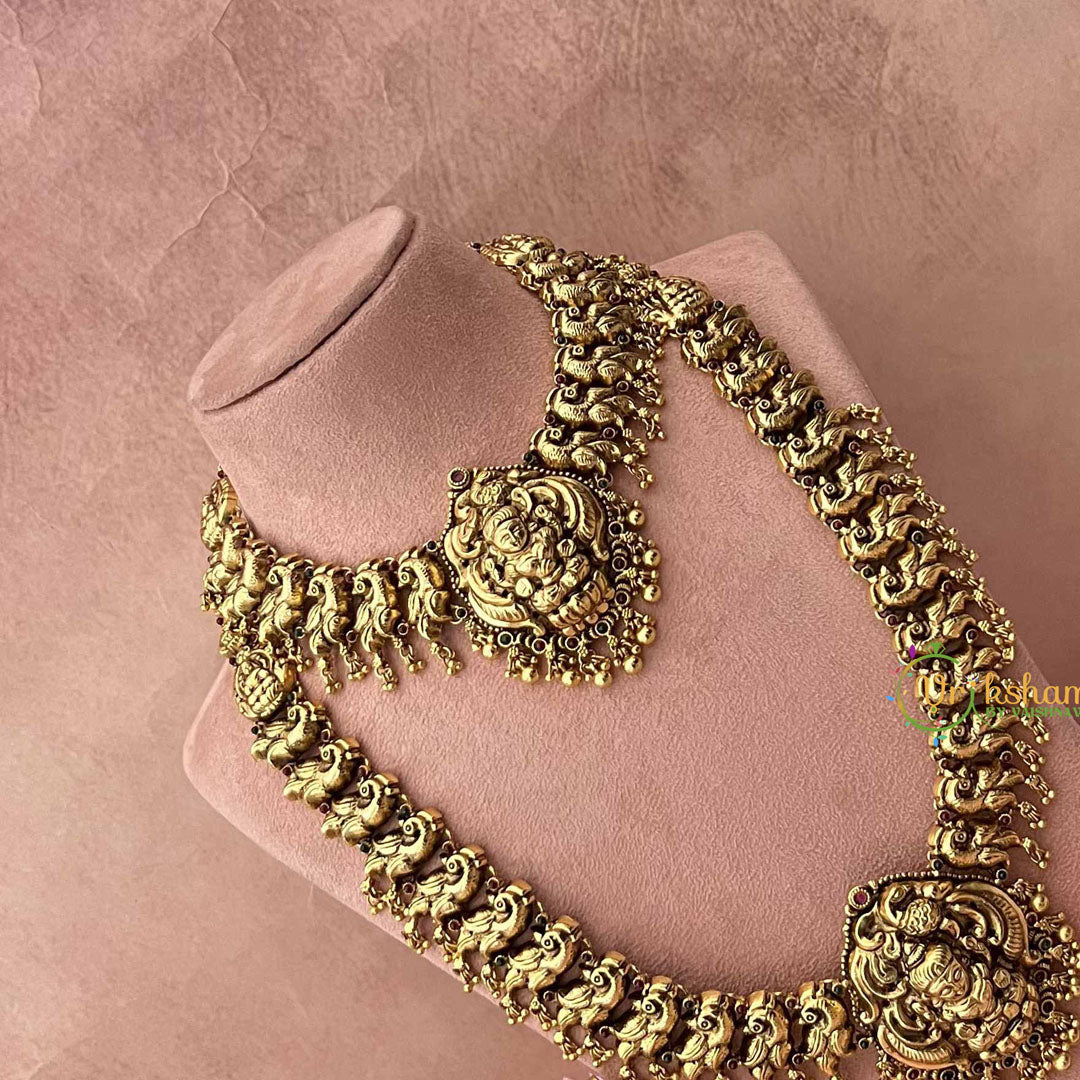 Celebrate divine elegance with this stunning bridal set, featuring the revered Lakshmi motif paired with an ornate golden peacock design. Crafted with meticulous attention to detail, this antique-inspired piece showcases radiant gold beads that catch light beautifully, creating an ethereal shimmer. The combination of auspicious symbolism and luxurious craftsmanship makes this set a treasured choice for brides seeking spiritual significance alongside timeless beauty. Perfect for weddings and milestone celebrations, this sophisticated ensemble embodies the grace and prosperity associated with traditional Indian bridal jewelry.