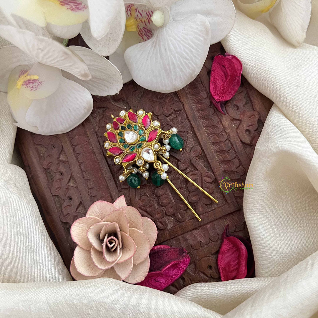 Elevate your traditional hairstyle with the Vriksham Antique Lotus Floral Jada Billai, adorned with exquisite red, green, and white stones. This intricately crafted piece features a green bead accent, blending classic elegance with vibrant color. Perfect for bridal wear or festive occasions, it enhances your look with refined charm and timeless beauty.