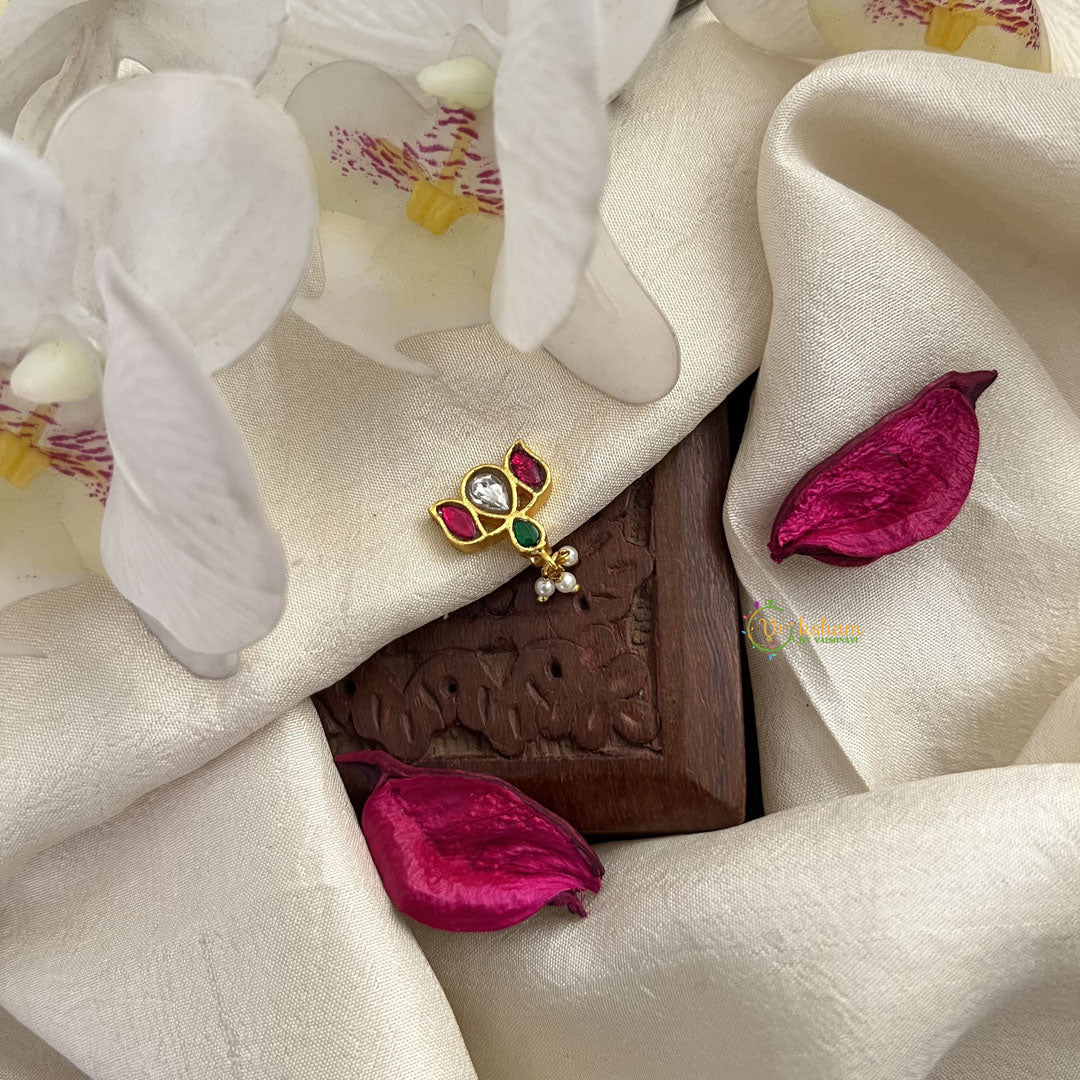 Elevate your style with Vriksham's Antique Lotus Jadau Kundan Nath. Featuring a stunning combination of red, green, and white pearls, this handcrafted piece exudes elegance and luxury. Make a statement at any occasion with this timeless and exclusive design.