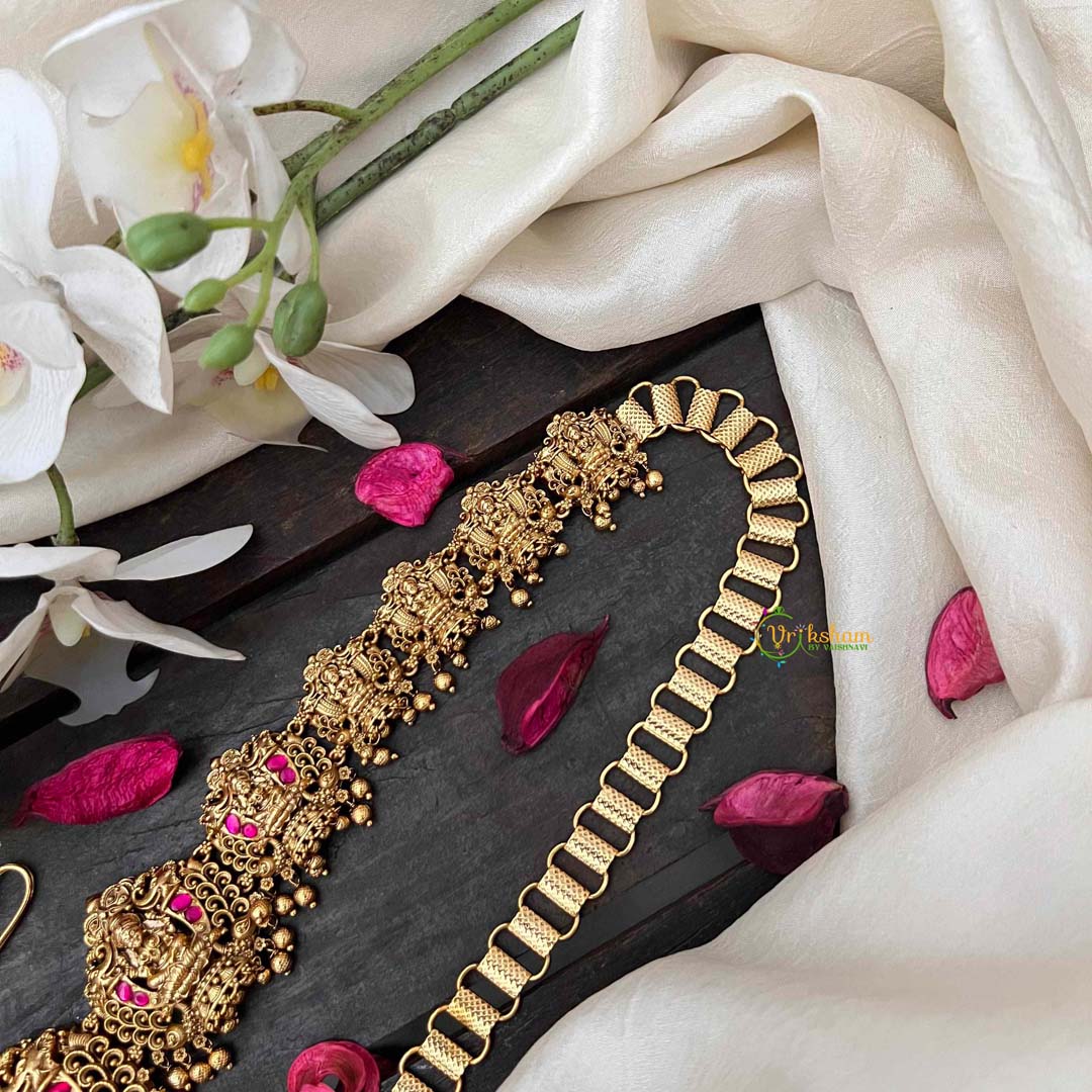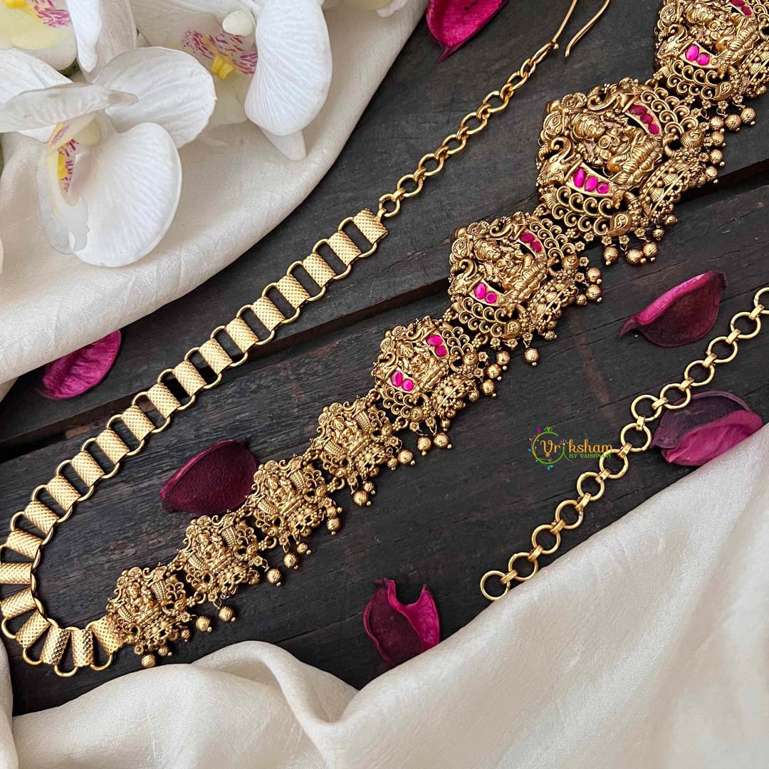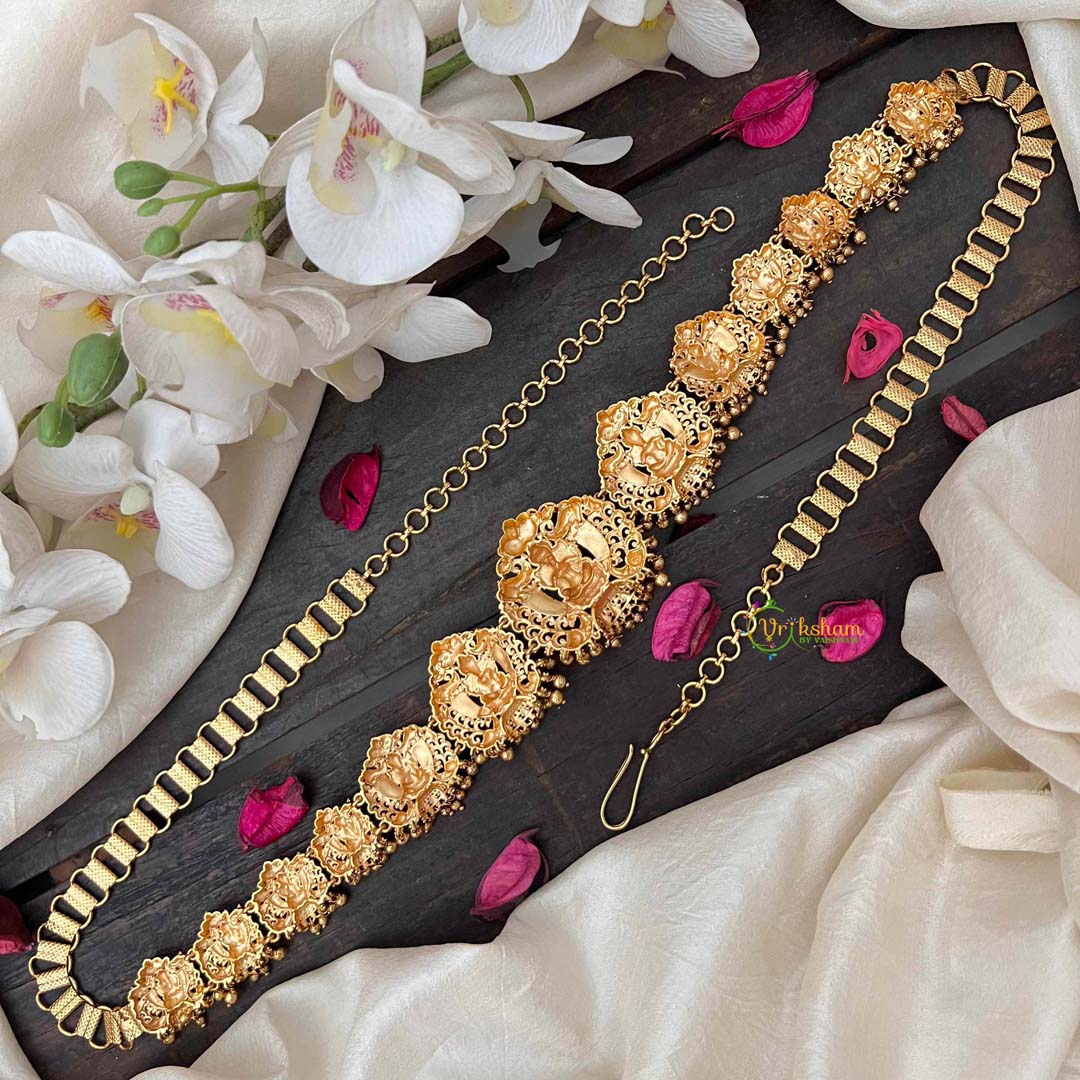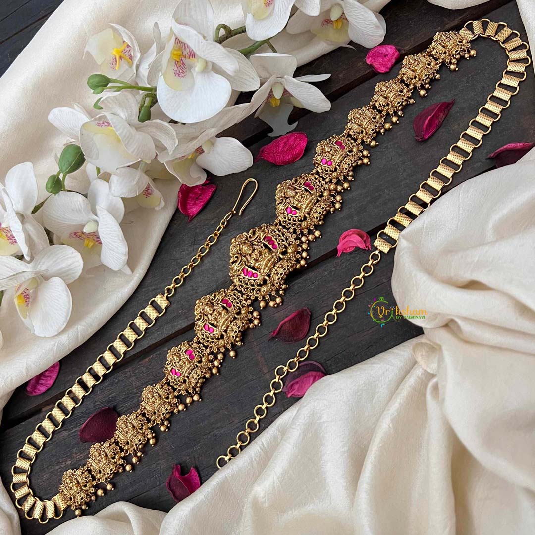 Elevate your bridal presence with this stunning Antique Lotus Lakshmi Jhumka Style Hipchain, a harmonious fusion of deep crimson elegance and gleaming gold beads. The antique-finished jhumka design pays homage to the sacred lotus and goddess Lakshmi, rendered with meticulous craftsmanship that speaks to centuries of artistic tradition. Each gold bead radiates warmth and luxury, creating a luminous contrast against the rich red backdrop. The gracefully suspended design ensures fluid movement, while the intricate detailing celebrates cultural heritage with refined sophistication. Perfect for discerning brides seeking a meaningful accessory that transcends fleeting trends, this hipchain embodies prosperity, spiritual significance, and timeless beauty. An investment in authentic artistry that becomes a cherished heirloom, transforming your bridal look into a masterpiece of elegance and cultural pride.