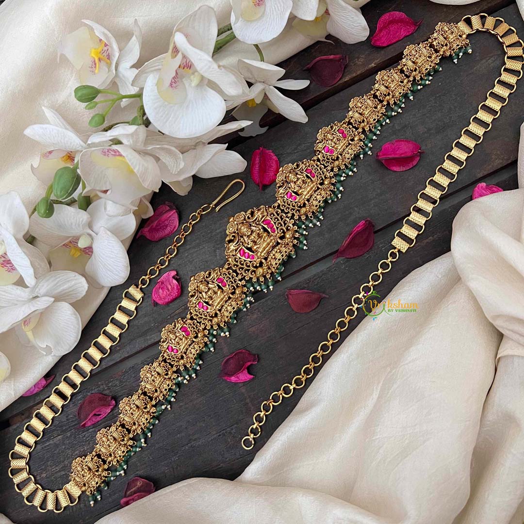Discover timeless allure with this Antique Lotus Lakshmi Jhumka Style Hipchain, a masterpiece that marries classical aesthetics with bridal sophistication. Featuring an enchanting red and green palette accented with verdant beads, this piece celebrates the sacred lotus and goddess Lakshmi through its ornate jhumka-inspired design. The antique finish lends an air of vintage elegance, while the intricate detailing captures the essence of traditional Indian craftsmanship. Each element—from the delicate lotus motifs to the gracefully suspended beads—creates a harmonious composition that moves beautifully with you. This distinctive hipchain transforms your bridal ensemble into a gallery of cultural artistry, offering brides a refined accessory that honors heritage while making a bold, unforgettable statement of elegance and spiritual significance.