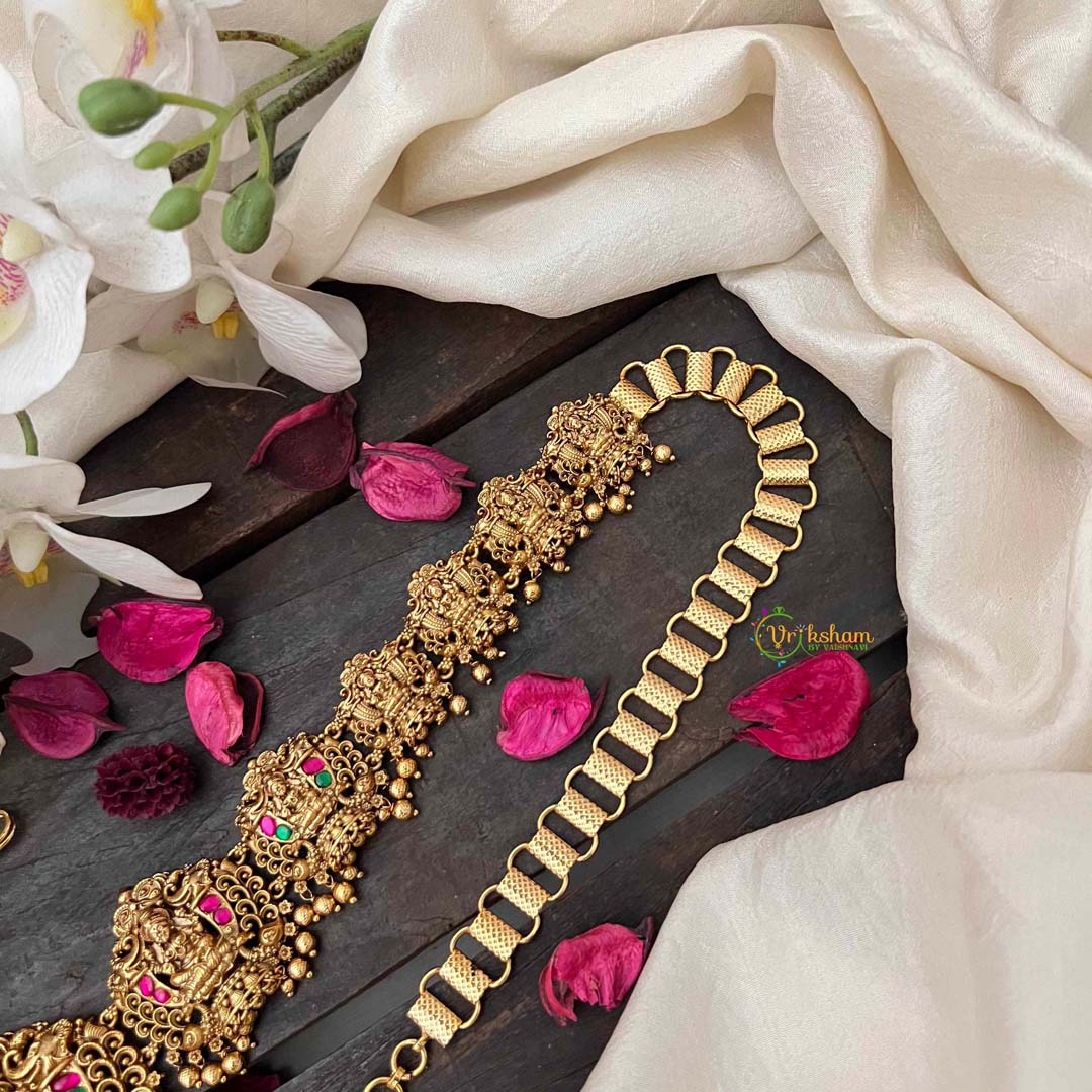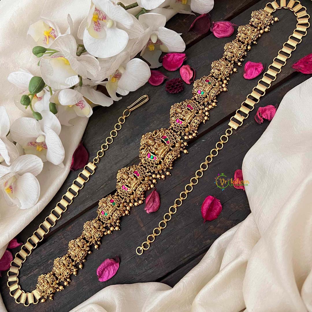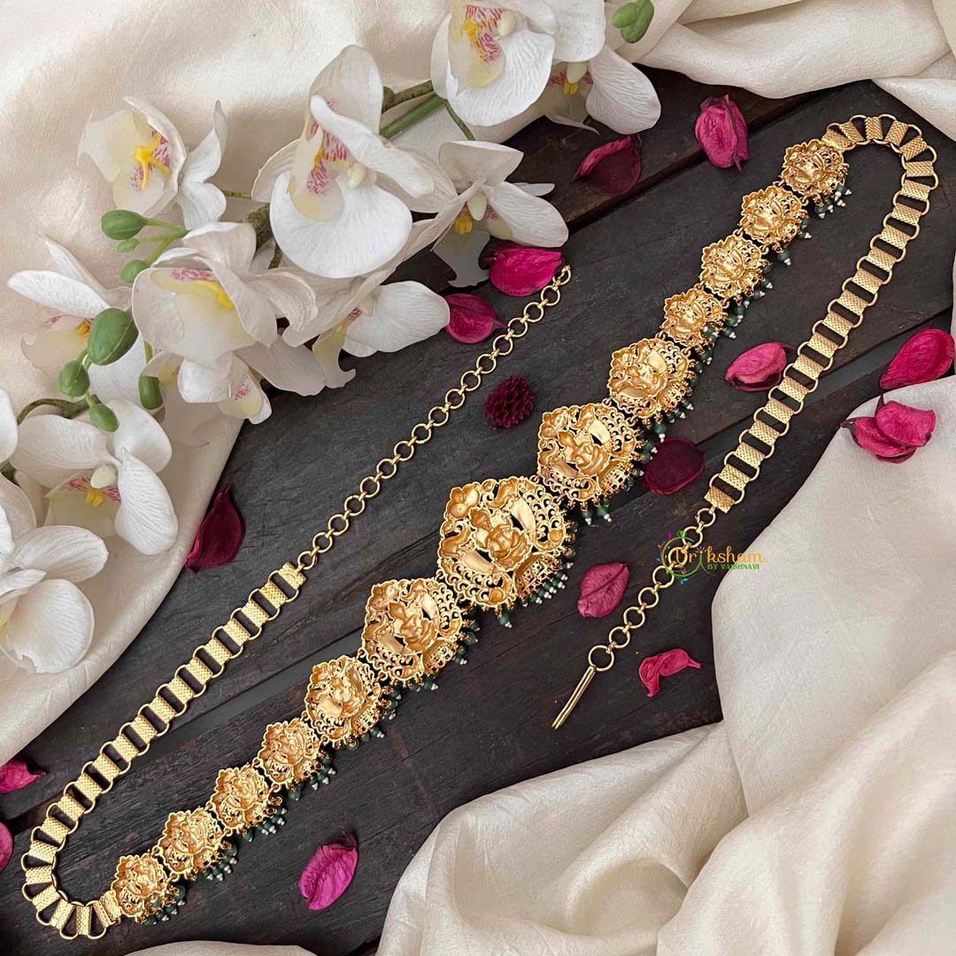 Indulge in vintage elegance with this Antique Lotus Lakshmi Jhumka Style Hipchain, a captivating blend of red, green, and emerald beads that evoke natural splendor. The jhumka-inspired design showcases the sacred lotus and revered Lakshmi imagery, rendered in an antique finish that whispers of timeless heritage. Each bead is thoughtfully selected to create a cohesive, jewel-toned aesthetic that radiates understated luxury. The flowing construction ensures graceful movement, while the intricate craftsmanship speaks to generations of artisanal tradition. Perfect for brides seeking a distinctive accessory that transcends conventional bridal wear, this hipchain celebrates cultural depth and refined taste. An investment in authentic artistry that becomes a treasured heirloom, embodying prosperity, spirituality, and enduring beauty.