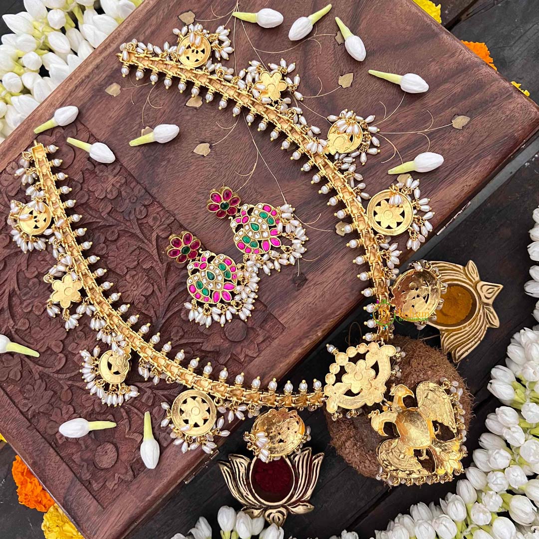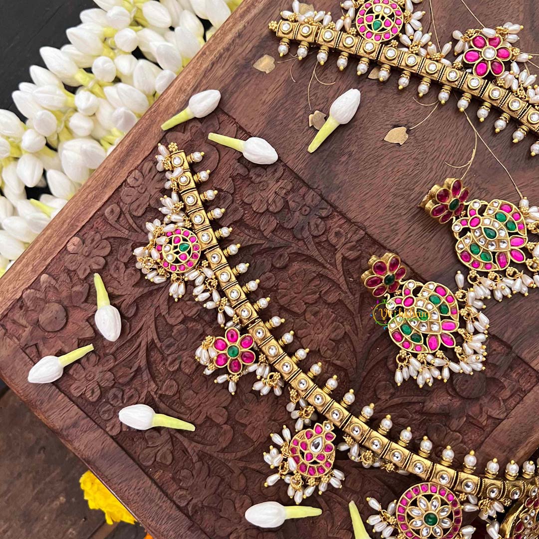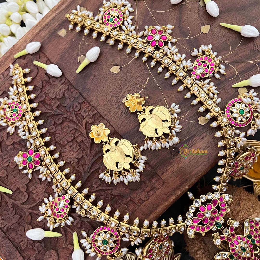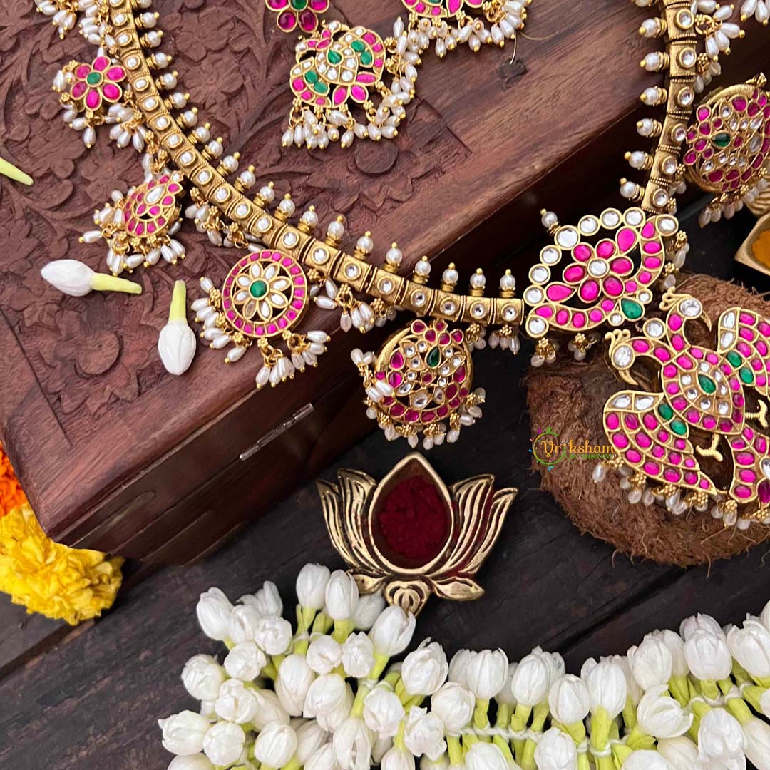 Embrace timeless elegance with this exquisite Antique Nakshi Garudbenda long neckpiece, a masterpiece of traditional Indian craftsmanship. Featuring intricate Kundan Jadau work adorned with lustrous rice pearls, this piece showcases the ornate Guttapusalu design that has graced generations. The antique finish lends an authentic, heritage-rich appeal, while the sophisticated detailing makes it perfect for weddings, festivals, and special occasions. A statement piece that seamlessly blends classical artistry with refined beauty, this neckpiece is an investment in timeless jewelry that transcends trends.