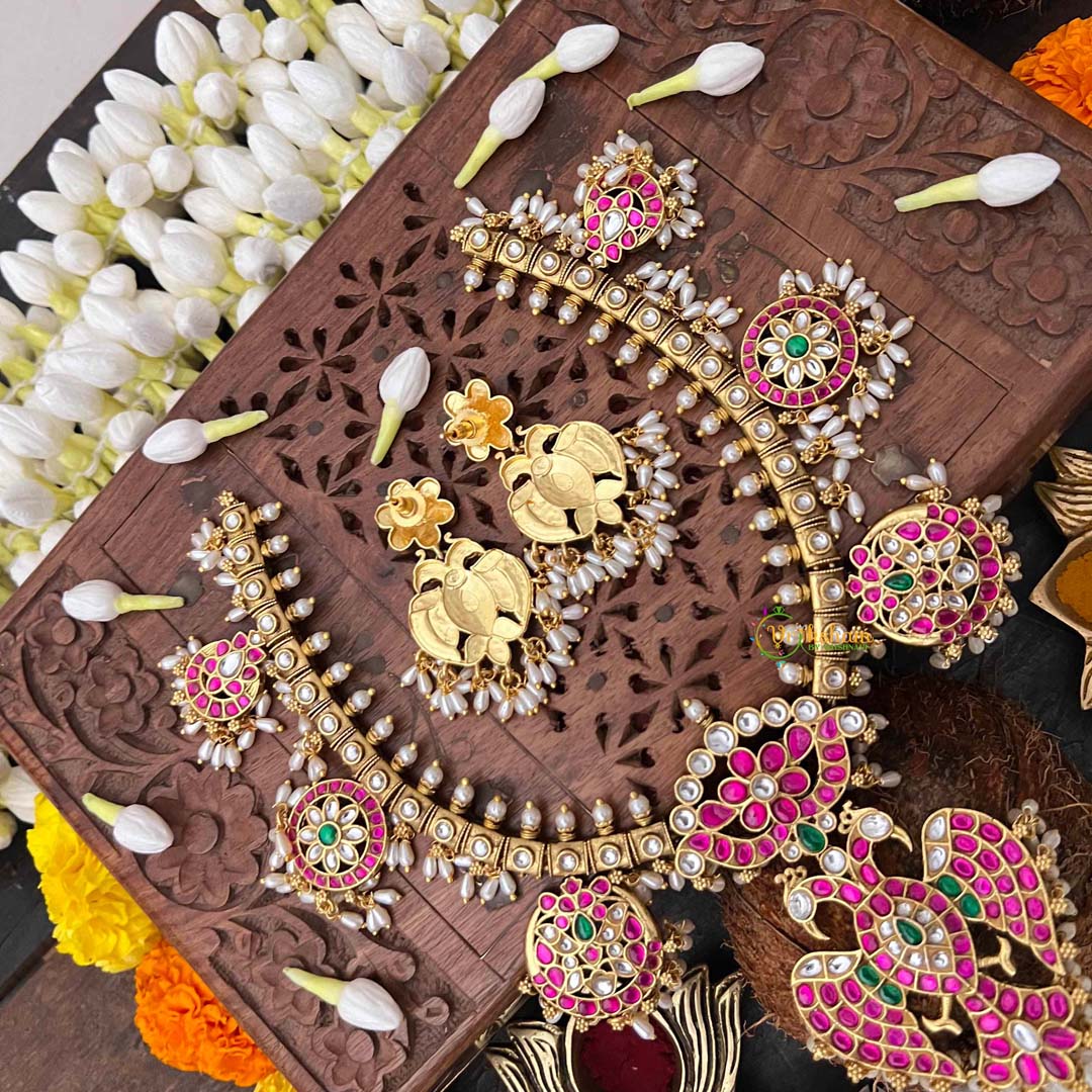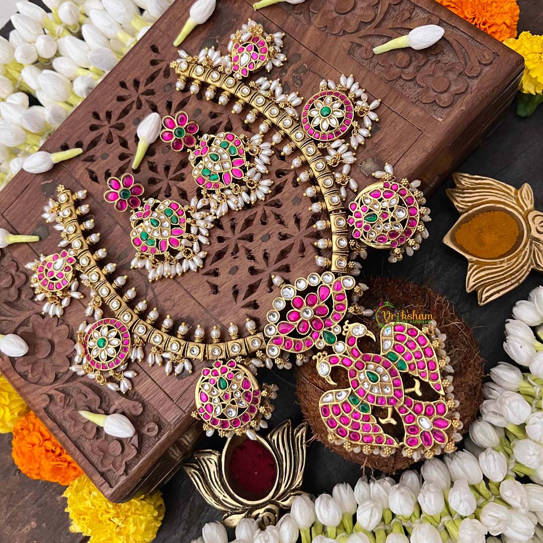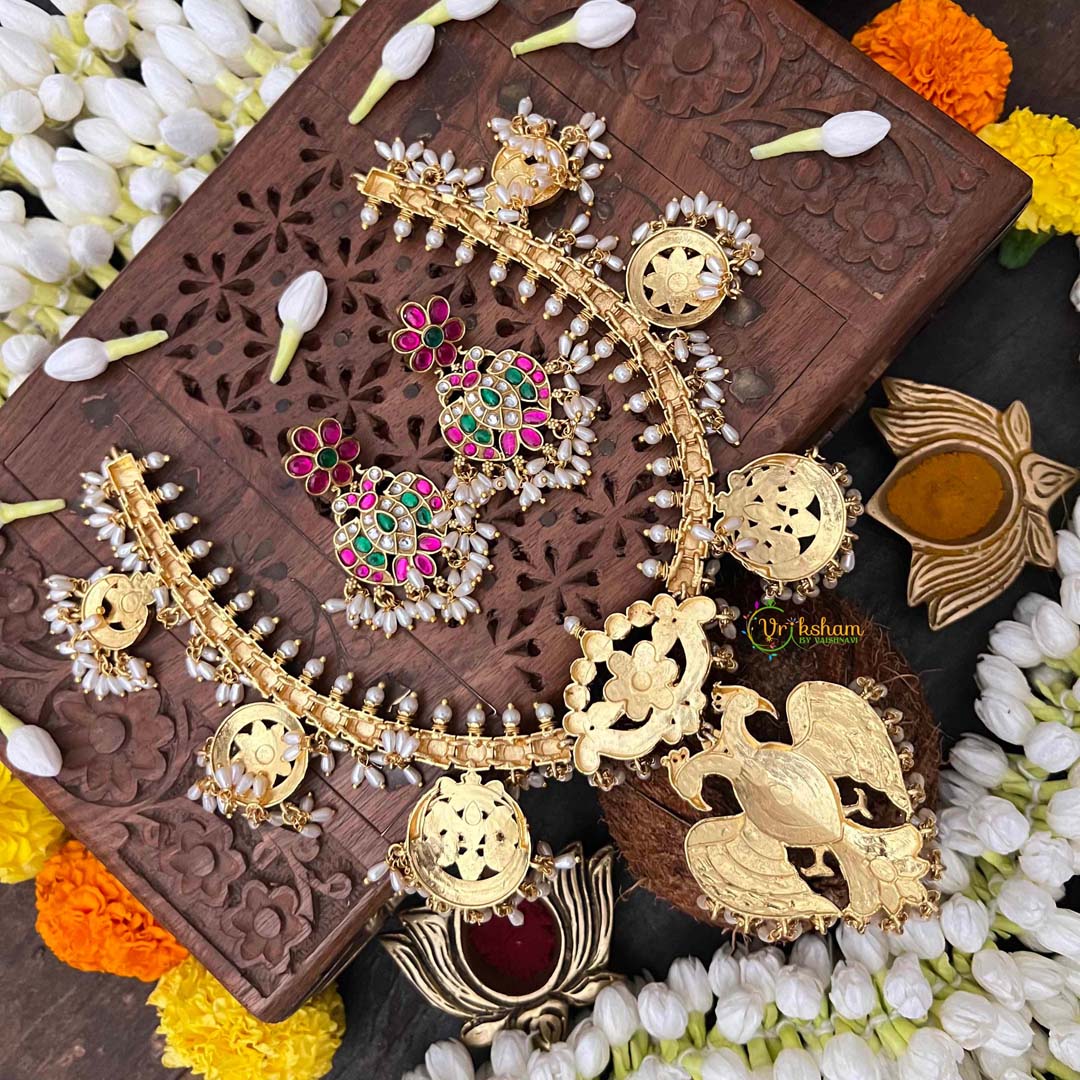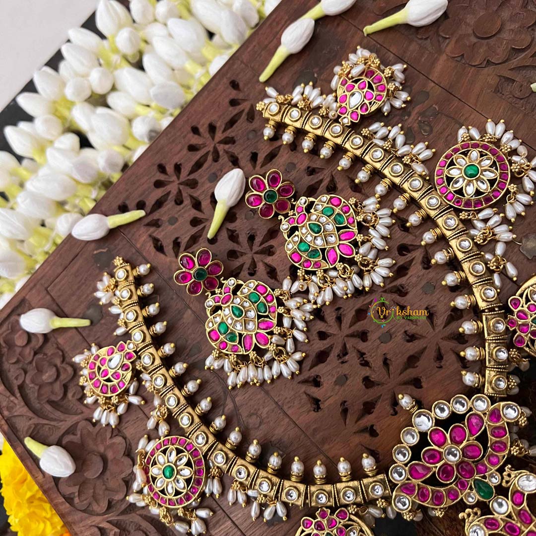 Discover the extraordinary artistry of this Antique Nakshi Gandaberund Kundan Jadau Guttapusalu Short Neckpiece, a masterpiece steeped in South Indian jewelry heritage. The gandaberund design—traditionally worn by brides—features intricate nakshi work with hand-carved detailing that showcases unparalleled craftsmanship. Luminous rice pearls cascade throughout, creating an ethereal luminescence against the antique gold base. The guttapusalu granulation technique imparts distinctive texture and vintage character, while kundan jadau setting ensures each pearl is individually secured with meticulous precision. This short neckpiece drapes gracefully at the collarbone, making it equally suited for weddings, festive occasions, or those seeking to honor classical Indian artistry. An heirloom-quality treasure for discerning collectors who value authenticity, heritage, and uncompromising excellence.