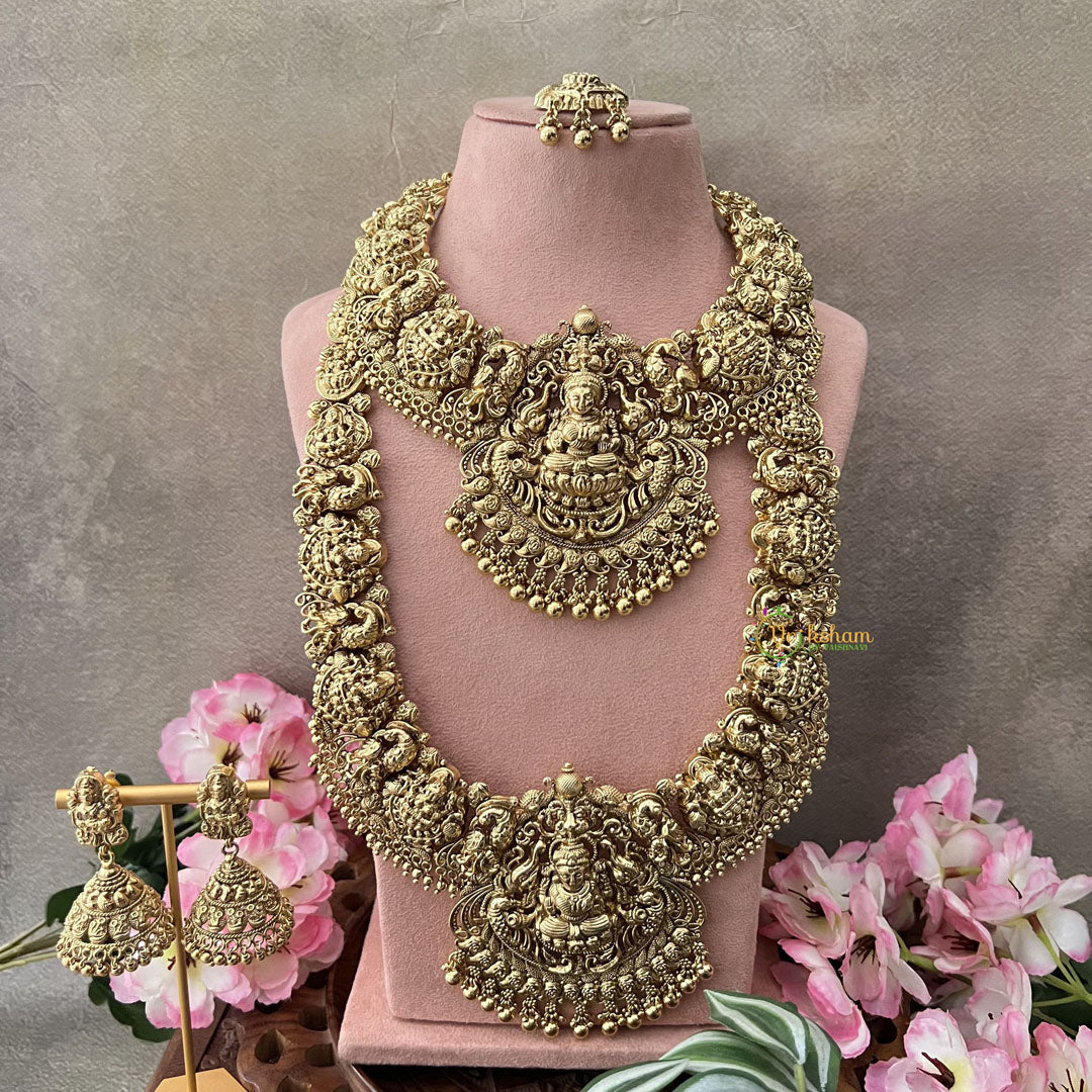 The Vriksham Antique Nakshi Lakshmi Bridal Set showcases exquisite craftsmanship with intricate Nakshi work and a timeless Lakshmi motif. This elegant set embodies heritage and sophistication, offering a regal touch to your bridal attire and making it a perfect choice for a bride seeking classic beauty and cultural richness.