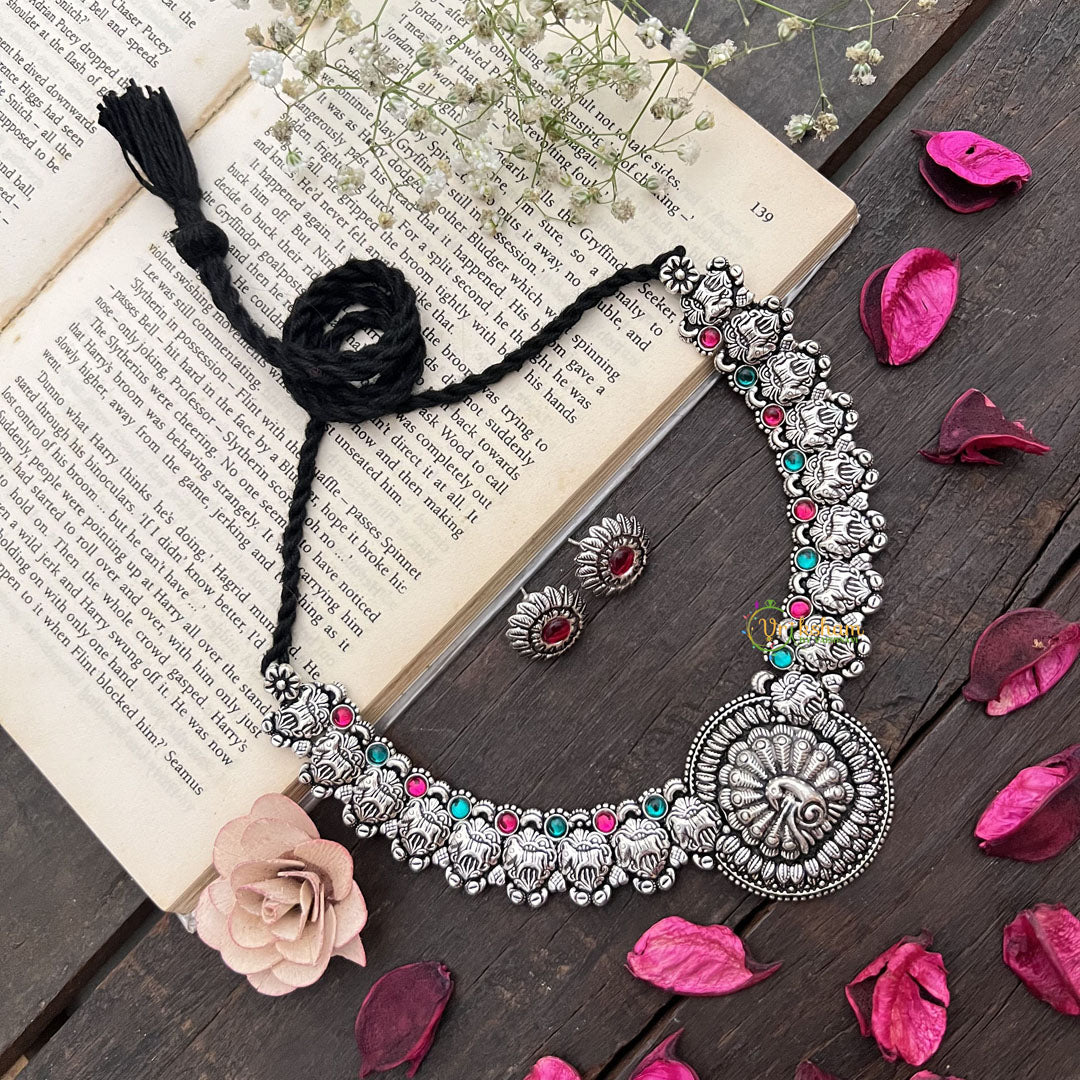 Elevate your ensemble with the Vriksham Antique Oxidized Silver Peacock Temple Neckpiece, featuring exquisite red and teal accents. Crafted meticulously to showcase intricate peacock motifs, this neckpiece blends traditional artistry with timeless elegance. Its oxidized silver finish enhances the vintage appeal, making it a distinguished accessory for both festive occasions and refined gatherings.