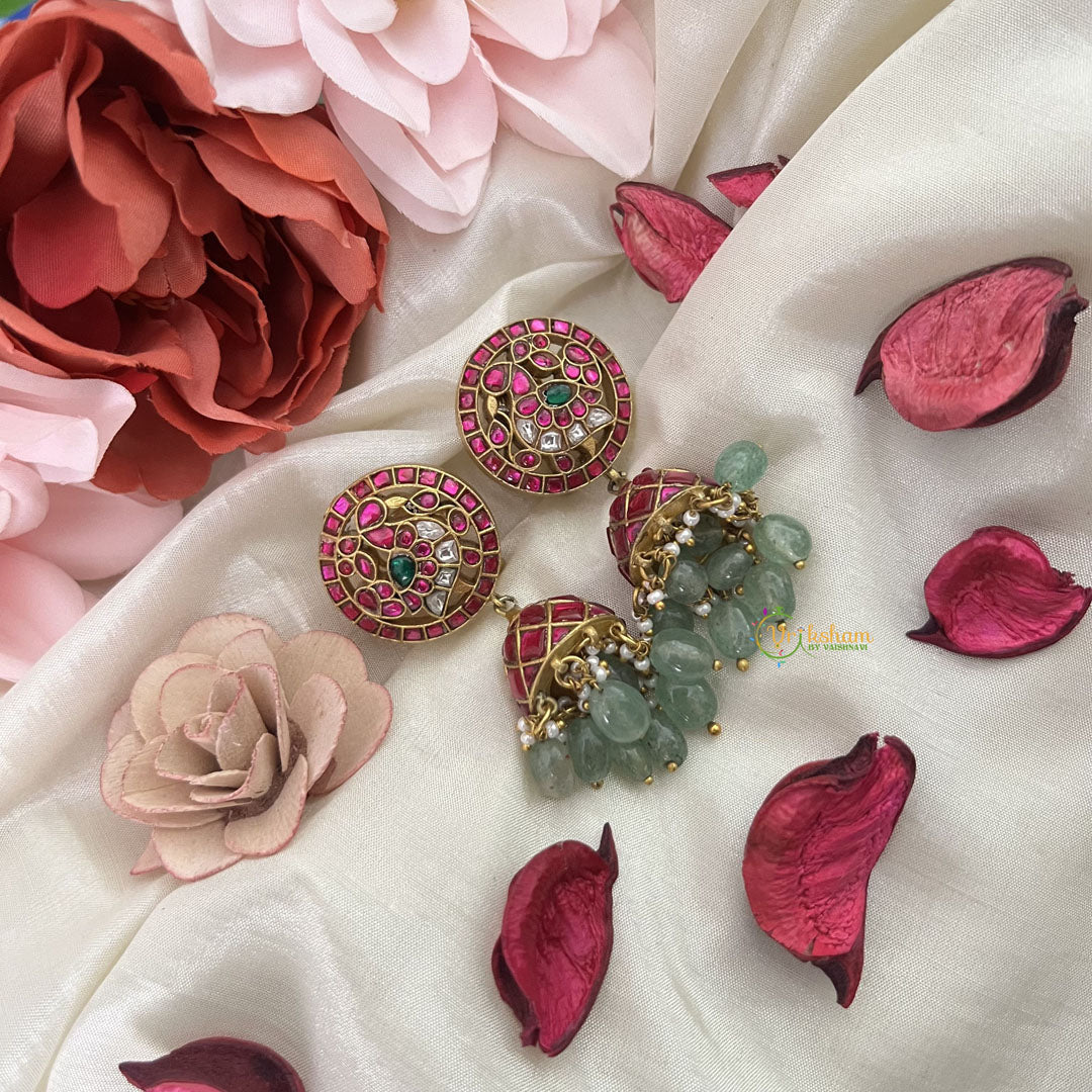 Indulge in the refined heritage of Vriksham's Antique Peacock Kundan Jadau Cuff Jhumkas. These distinguished ornaments showcase the majestic peacock motif—a timeless symbol of beauty and grace—meticulously crafted using traditional Kundan Jadau techniques. The antiqued finish imparts a sense of cherished provenance and enduring elegance, while subtle aqua green beads add dimensional depth and gentle luminosity.