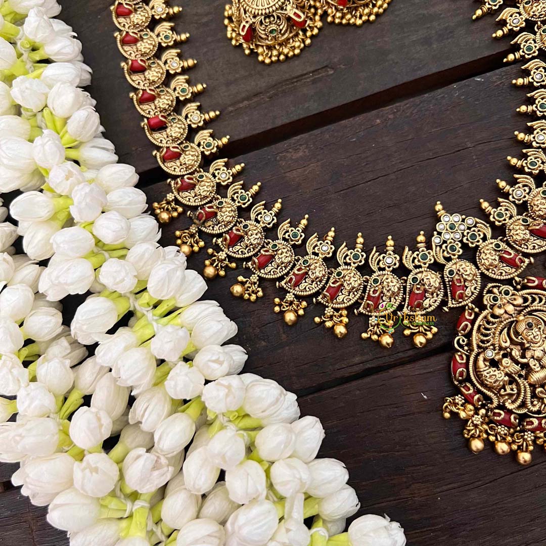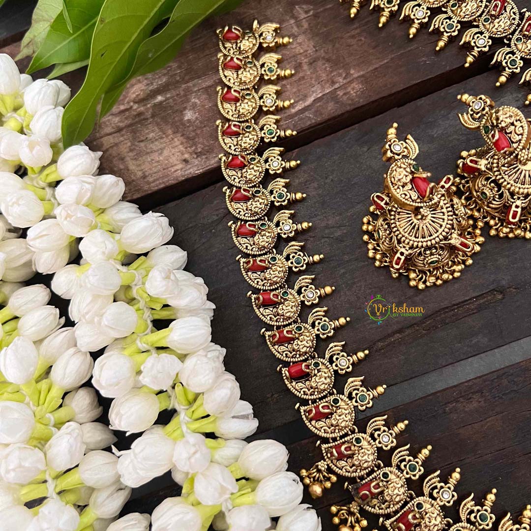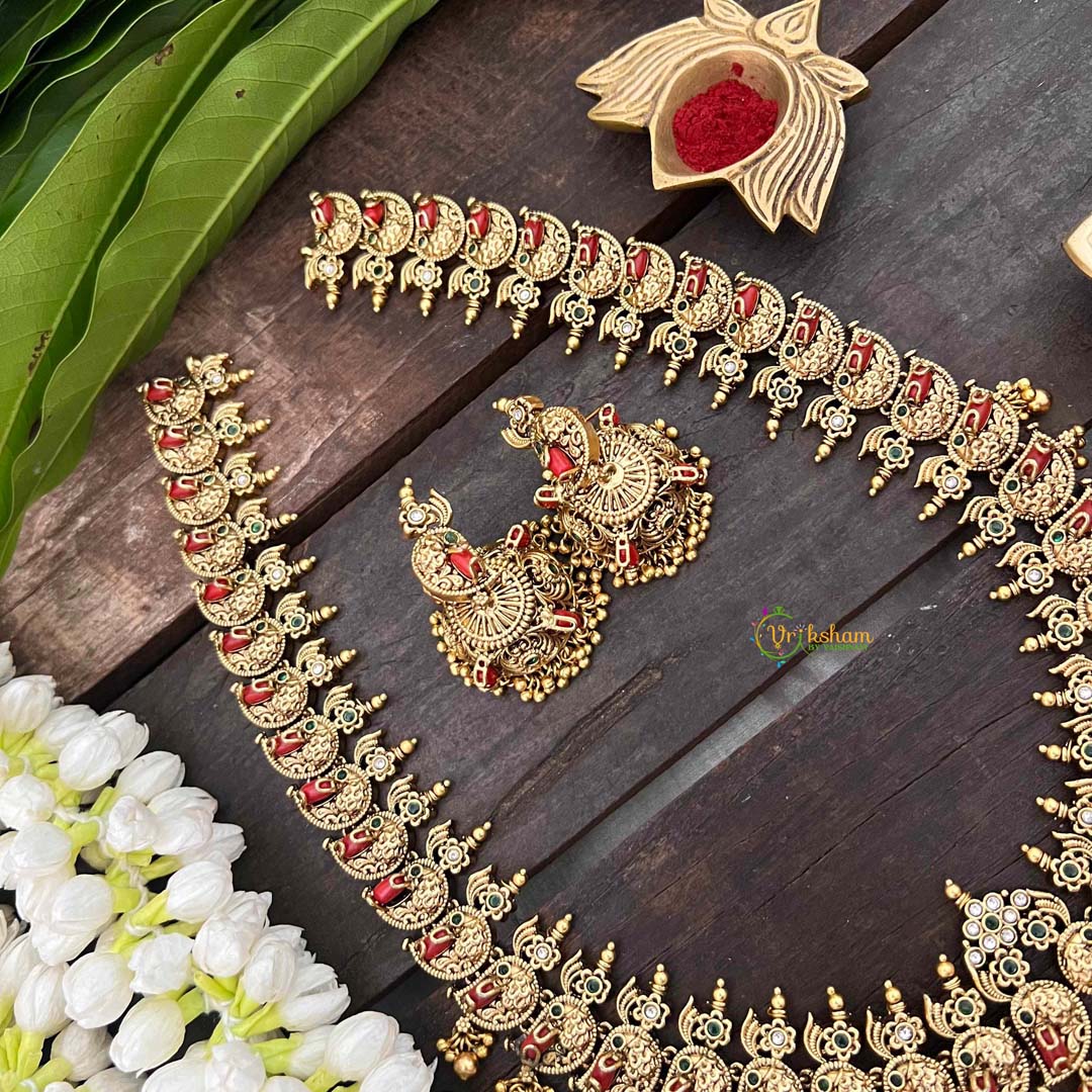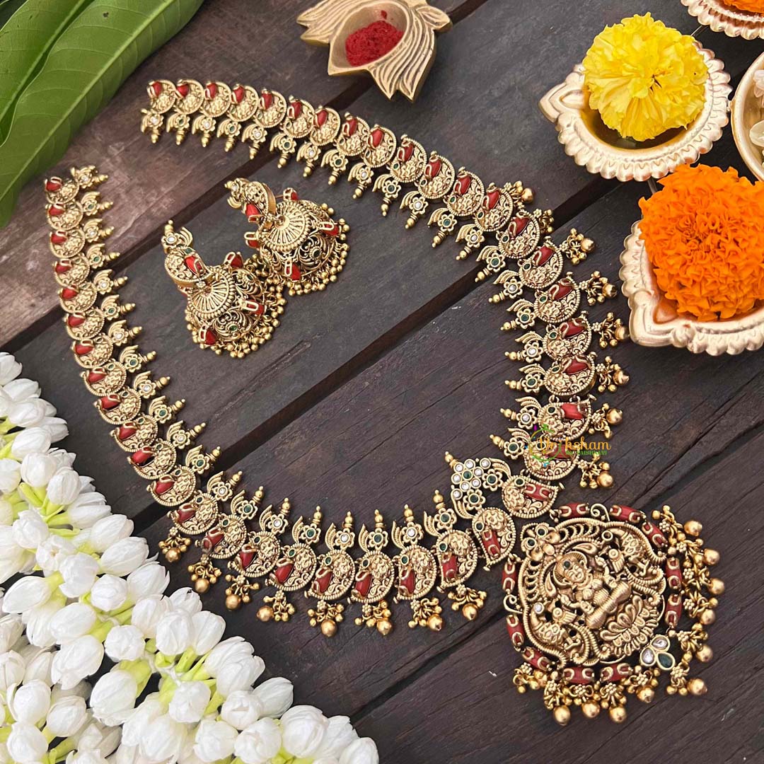 Indulge in the luxury of our Antique Peacock Lakshmi Long Neckpiece. Adorned with intricate golden beads, this handcrafted necklace features a stunning peacock design, inspired by the goddess Lakshmi. Elevate your style with this sophisticated and exclusive piece, perfect for any special occasion. Comes with matching earrings.