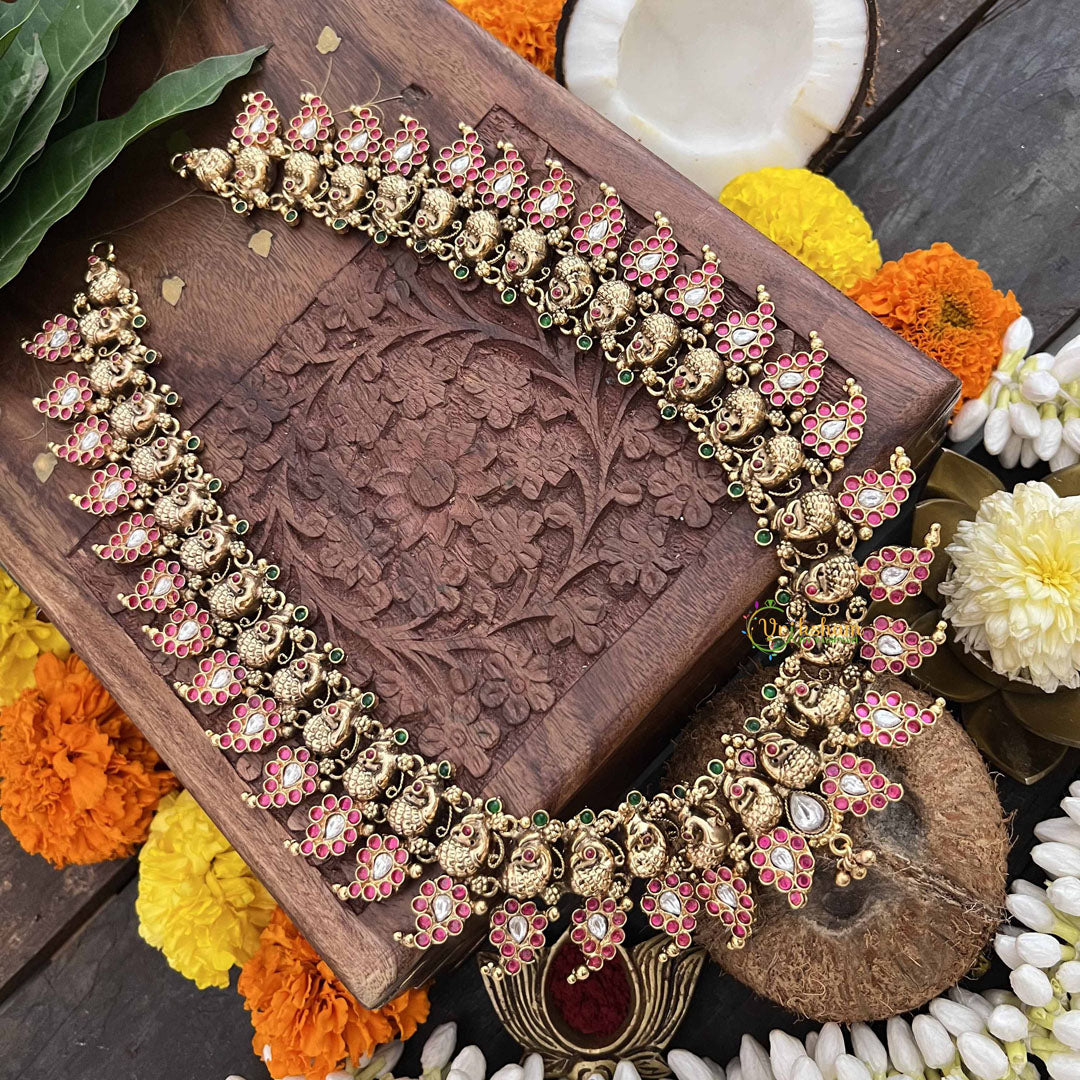 The Vriksham Antique Peacock Neckpiece, crafted in 1 gram of gold, showcases an exquisite peacock design adorned with red, green, and white stones. This refined combination of colors and intricate detailing offers a timeless elegance, making it a sophisticated accessory that enhances traditional attire with vibrant charm.