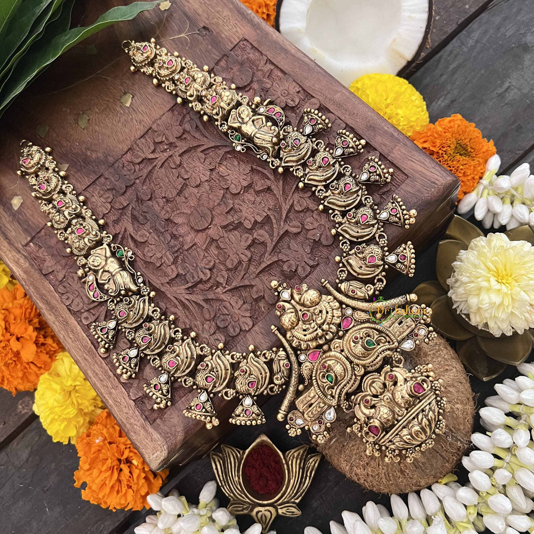The Vriksham Antique Peacock Style Long Neckpiece, crafted from 1 gram of gold, features an exquisite peacock design that reflects timeless elegance. Its elongated form and intricate antique detailing create a sophisticated accessory that complements traditional attire with a touch of heritage-inspired charm.