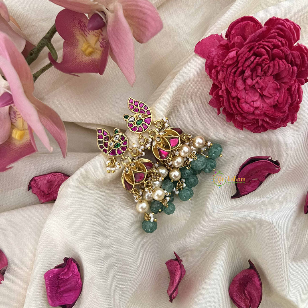 The Vriksham Antique Peacock Style Kundan Jadau Jhumkas showcase exquisite craftsmanship with detailed peacock motifs and vibrant green beads. These jhumkas blend traditional elegance with antique charm, making them an ideal accessory for special occasions. Their intricate kundan work enhances sophistication, adding a graceful, timeless appeal to your ensemble.