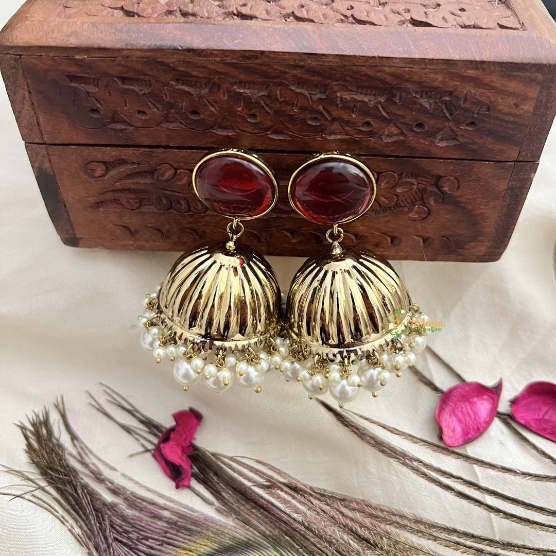 The Vriksham Antique Red Circle Jhumka features a rich red circular design accented by a gleaming golden dome and delicate white pearls. This sophisticated piece combines vintage charm with elegant detailing, perfect for enhancing any traditional ensemble with timeless grace.
