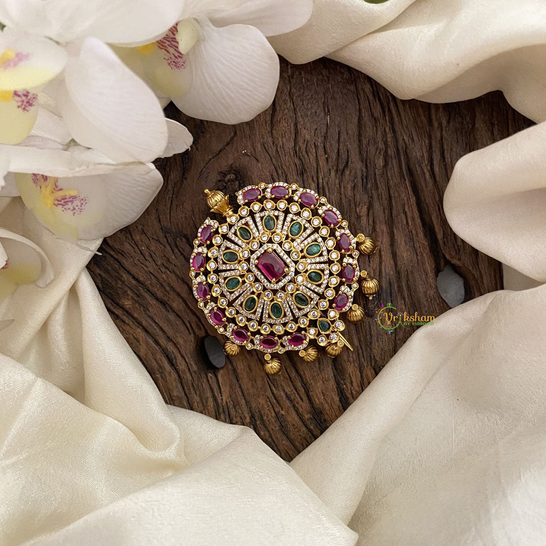 Indulge in the ultimate luxury with our Vriksham Antique Round AD Stone Bun Billai-Jada Billai. Handcrafted with exquisite red, green, and white stones, this bun billai adds a touch of elegance and sophistication to your look. Perfect for special occasions or everyday wear, it's a must-have for any fashion-forward individual.