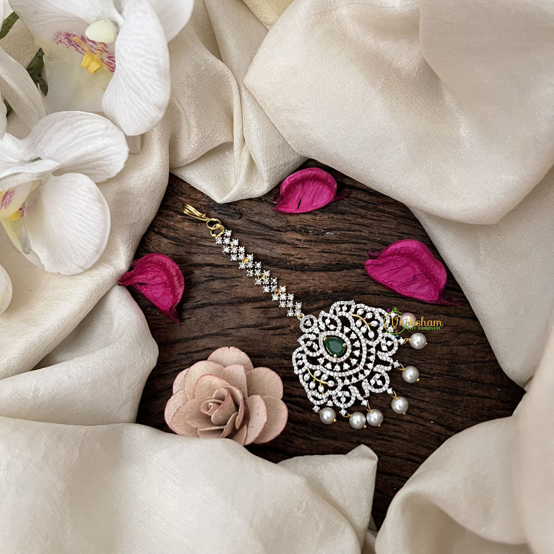 The Vriksham Antique Royal Radiance AD Stone Maang Tikka in green features a timeless design embellished with sparkling AD stones and elegant pearls. This sophisticated piece adds a regal and refined touch to traditional attire, perfect for elevating your look with classic charm on special occasions.