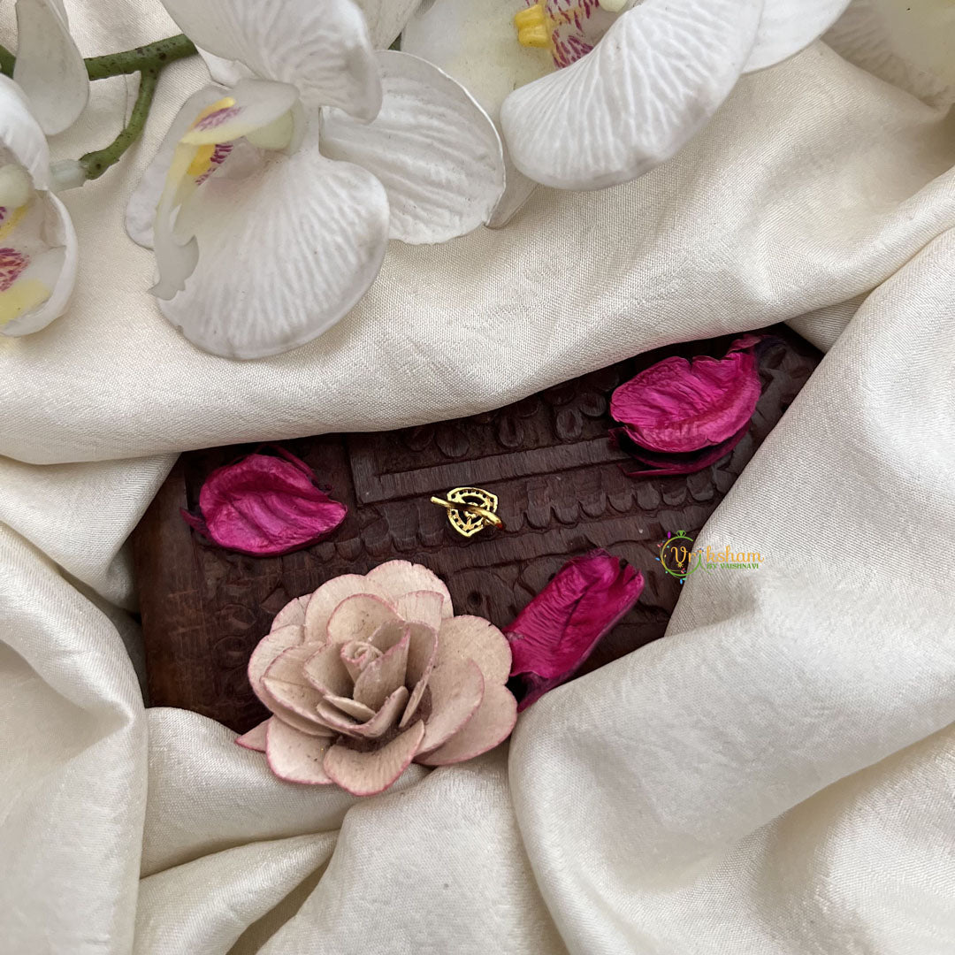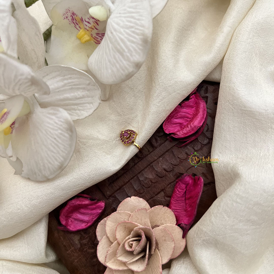The Vriksham Antique Trio Style Nath features a refined design with three striking red stones, capturing a vintage charm. Its press-on style ensures comfortable and secure wear, making it a sophisticated accessory that adds a timeless elegance to your look.