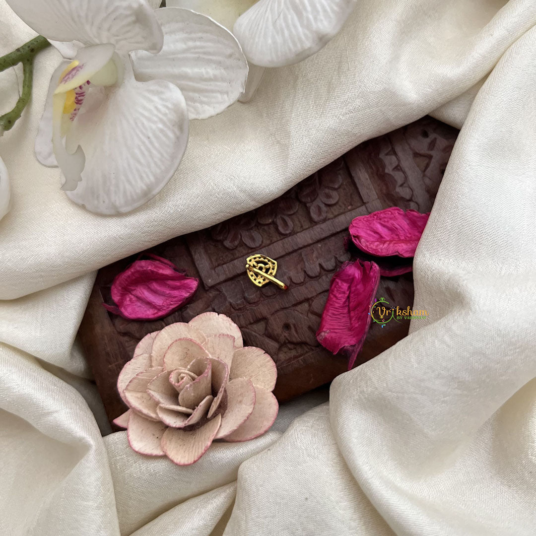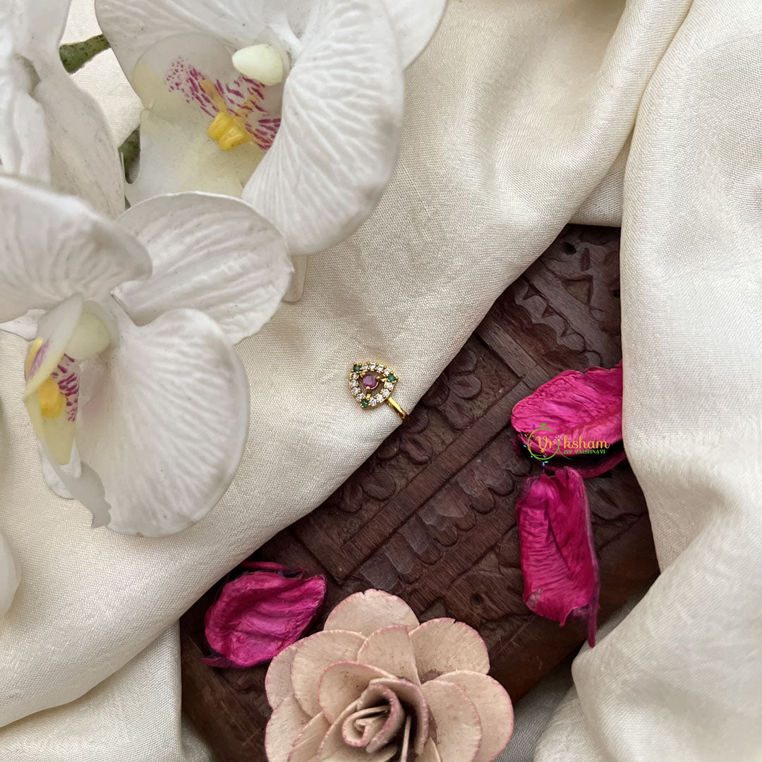 The Vriksham Antique Trio Style Nath features a classic design adorned with red, white, and green stones arranged in a timeless trio pattern. Its press-on style offers effortless comfort, making it a sophisticated accessory that enhances your traditional look with subtle elegance.