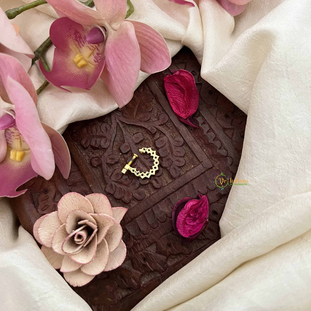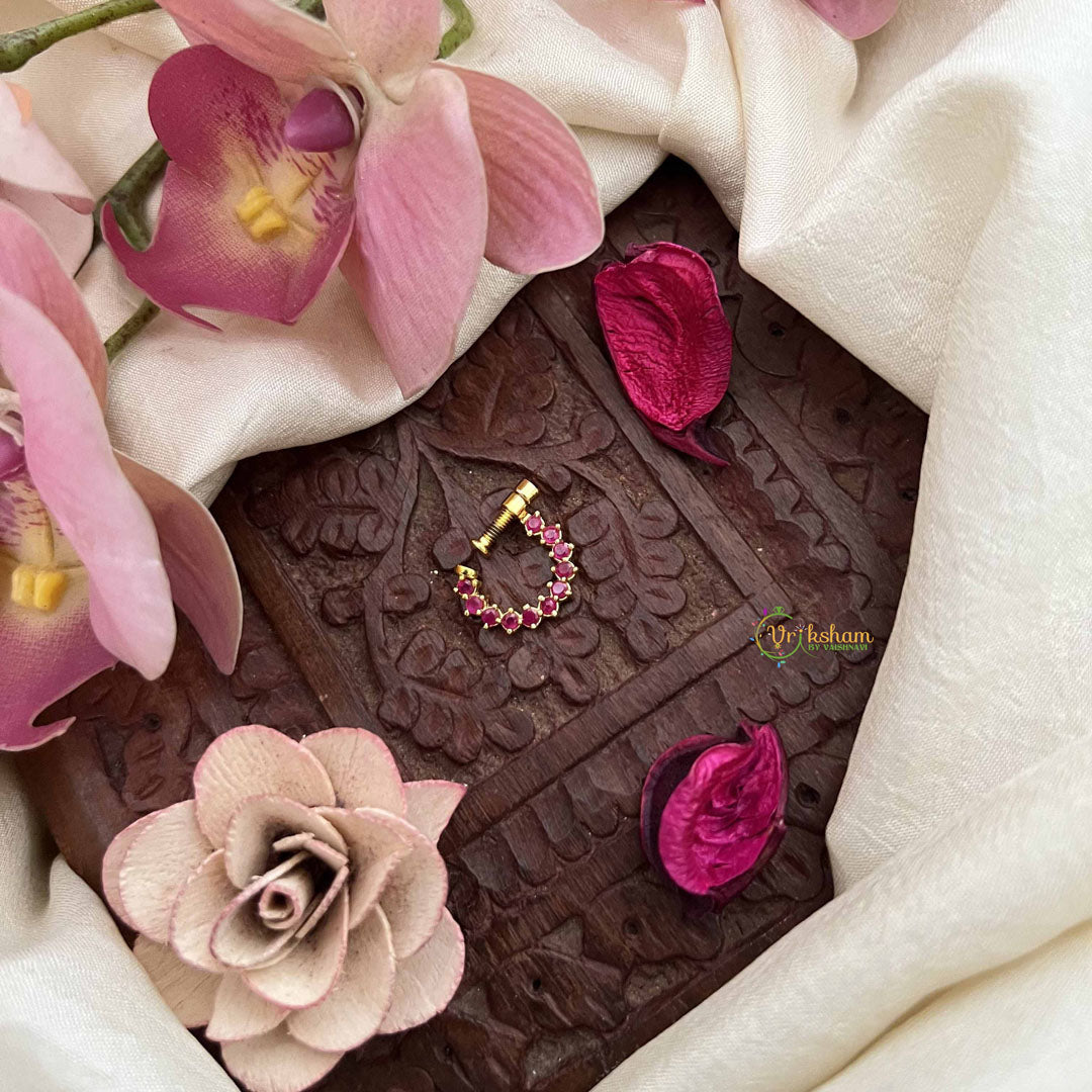 The Vriksham Antique Zigzag Dot Style Press Naths in red features a distinctive zigzag pattern accented with delicate dot details, evoking timeless elegance. Designed for a secure and comfortable press fit, this nose pin adds a refined statement piece that enhances both traditional and contemporary ensembles with subtle sophistication.