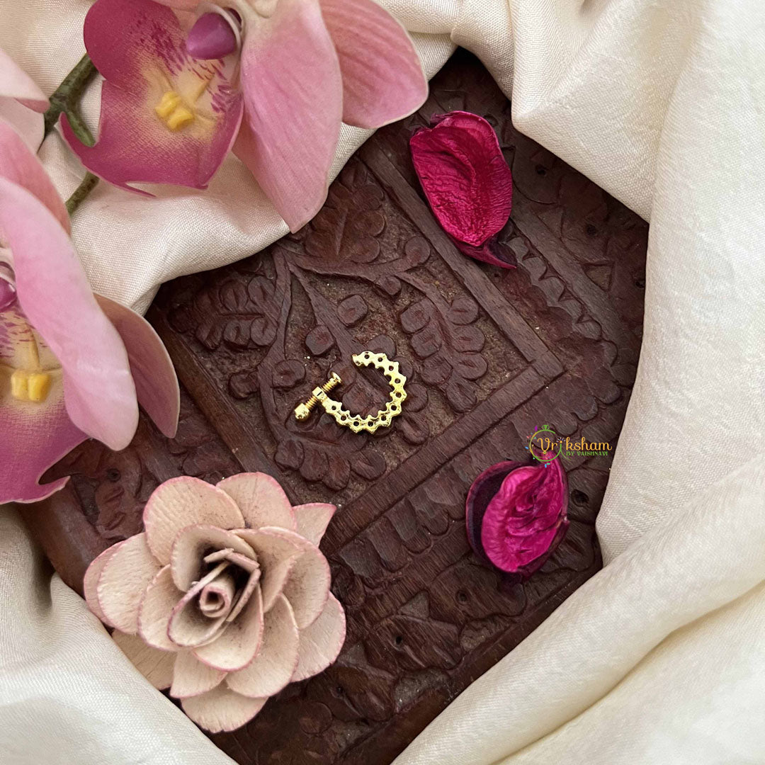 The Vriksham Antique Zigzag Dot Style Press Naths in red and white features a classic zigzag pattern highlighted by intricate dot accents. Crafted for a secure and comfortable press fit, this nose pin offers a sophisticated blend of colors and design that enhances both traditional and modern styles with timeless elegance.