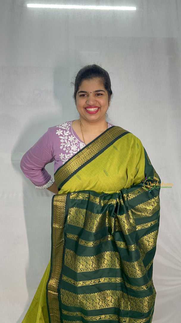 Celebrate natural beauty with this vibrant Kalyani cotton saree, featuring a fresh apple green base accented by a lush green border and delicate butta patterning. Crafted from premium Kalyani cotton, this saree delivers exceptional comfort and breathability, ensuring effortless wear throughout the day. The harmonious green tones create a refreshing, contemporary aesthetic while honoring traditional Indian design principles. Ideal for festivals, celebrations, and refined everyday occasions, this saree offers remarkable versatility across various settings. The ornamental butta motifs showcase authentic weaving heritage and add textural richness to the composition. Natural Kalyani cotton ensures superior drape, exceptional durability, and straightforward maintenance. A versatile wardrobe staple that combines cultural craftsmanship with modern comfort, perfect for the woman who appreciates understated sophistication and natural elegance.