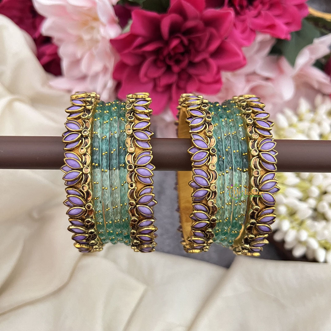 Elevate your elegance with the Vriksham Aqua Blue Glass Bangle Set, featuring intricate lotus and kundan floral designs crafted in silk thread. This sophisticated ensemble blends traditional artistry with vibrant aqua blue glass, adding a refined touch to any outfit. Perfect for special occasions, these bangles offer a graceful statement of timeless beauty and craftsmanship.