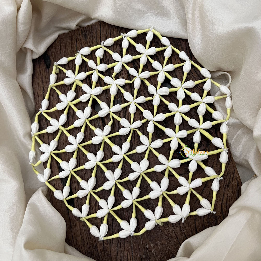 The Vriksham Artificial Jasmine Flower Bun Net Jada Hair Accessories offers a sophisticated way to adorn your bun with beautifully crafted jasmine flowers. This elegant accessory enhances your hairstyle with a timeless floral charm, ideal for weddings, festivals, and special occasions requiring a polished and graceful look.