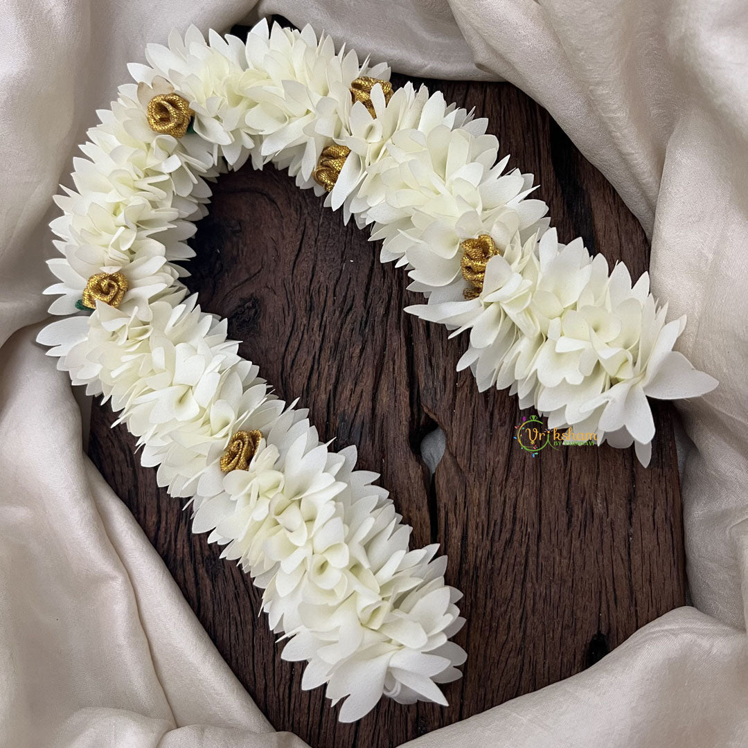 The Vriksham Artificial White Gajra Veni with Golden Rose offers a timeless blend of pure white blossoms accented by a striking golden rose. This elegant hair accessory adds a touch of luxury and sophistication to your traditional hairstyle, perfect for weddings and festive occasions. Lightweight and comfortable, it enhances your look with graceful charm and enduring beauty.