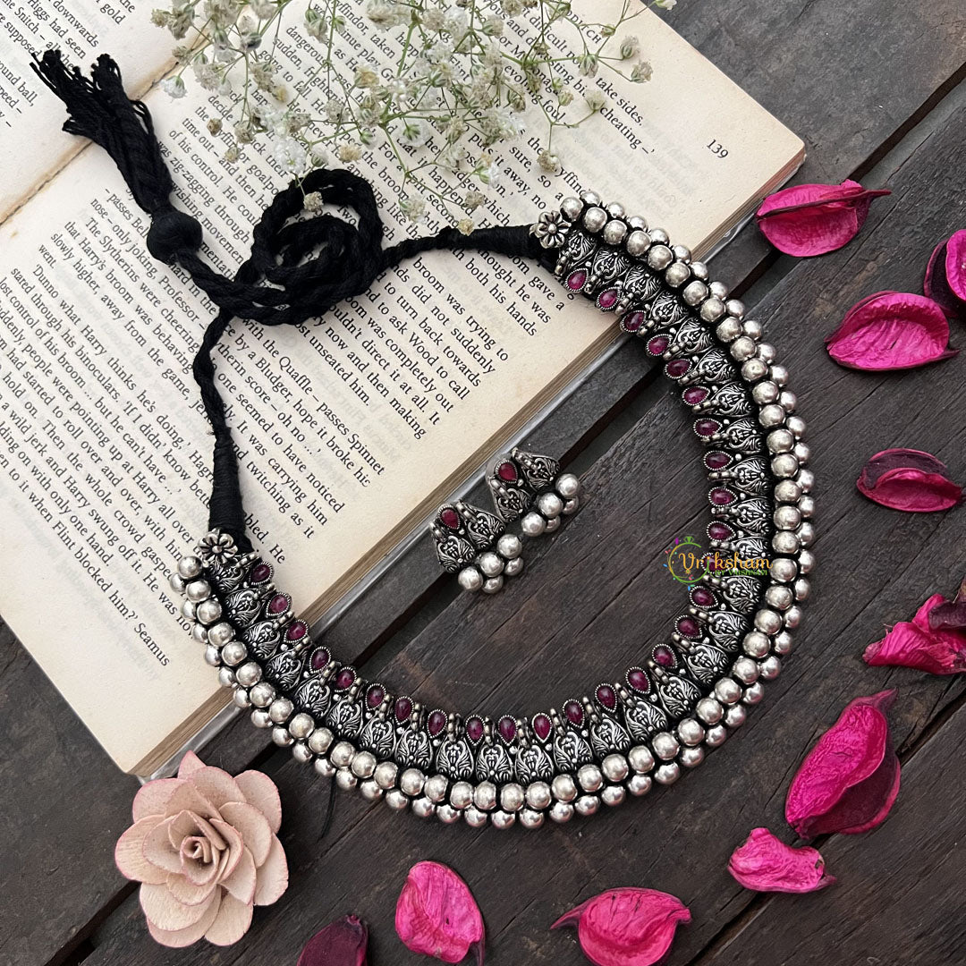 The Vriksham Artisan Oxidized Silver piece features intricate motifs beautifully enhanced with red stone inlays. Expertly crafted, this elegant accessory combines traditional artistry with a modern touch, offering a sophisticated statement perfect for special occasions. Its detailed design and vibrant red accents add refinement and timeless charm to your collection.