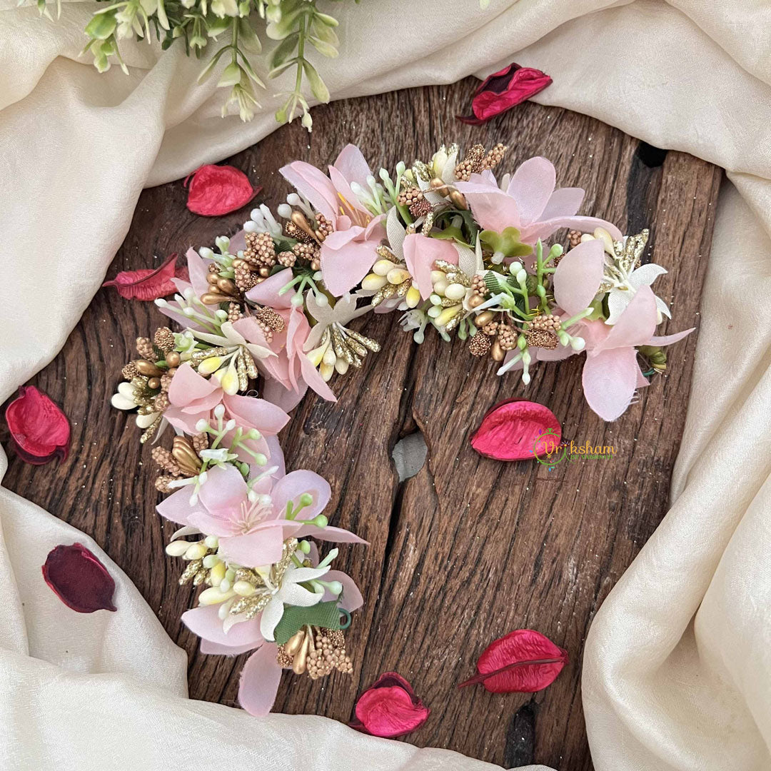 he Vriksham Baby Pink Floral With Beads Veni features soft baby pink blossoms enhanced with delicate bead accents. This sophisticated accessory adds a gentle and elegant touch to traditional hairstyles, perfect for special occasions and celebrations.