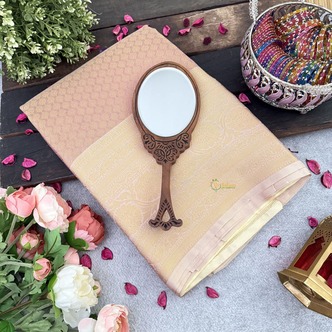 Immerse yourself in the refined allure of this Baby pink Katan Tanchoi Tissue Silk Saree, where artisanal excellence meets chromatic brilliance. The majestic baby pink palette creates a captivating canvas for the intricate tanchoi weaving, while the harmonious blend of katan and tissue silk offers an exquisite tactile experience. Each delicate motif reflects meticulous craftsmanship passed through generations. A distinguished addition to your collection that embodies quiet luxury and timeless grace.
