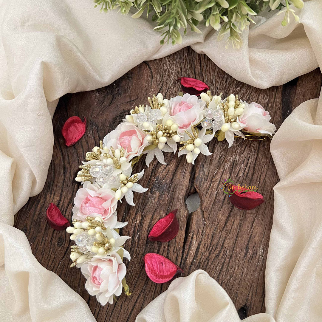 The Vriksham Baby Pink Rose Style Artificial Gajra features soft baby pink rose blossoms beautifully accented with delicate buds. This sophisticated accessory adds a tender and elegant charm to traditional attire, perfect for weddings and special occasions.