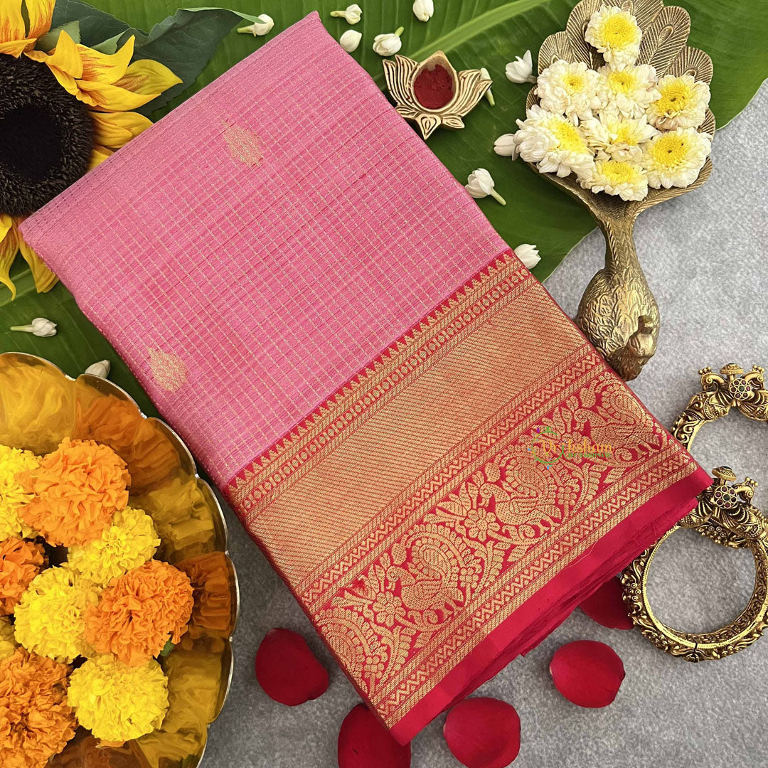Experience timeless grace with the Vriksham Baby Pink With Red Border Vairaoosi Korvai Pure Silk Saree. This delicate baby pink saree is enhanced by a striking red border featuring intricate Vairaoosi Korvai weaving in pure silk. The combination of soft hues and detailed craftsmanship creates a refined look, making it an ideal choice for elegant celebrations and formal occasions.