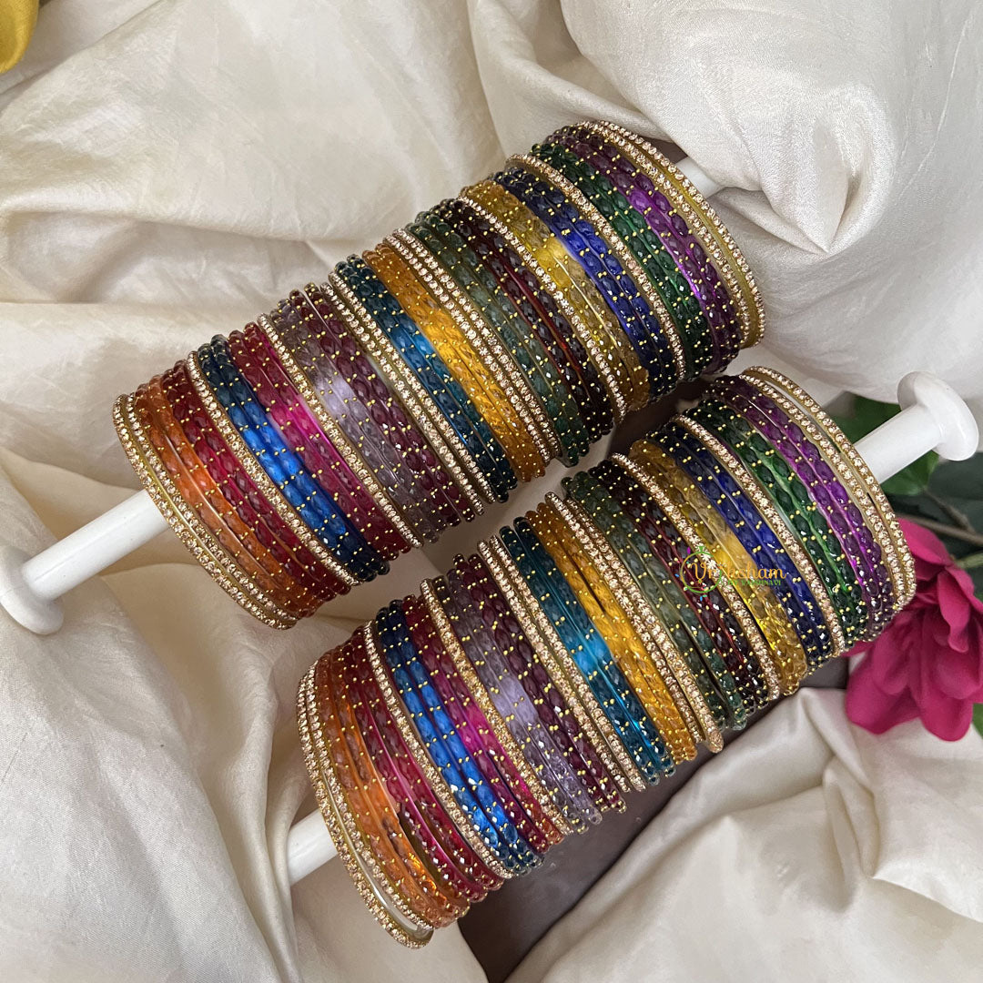 Elevate your celebration with the Vriksham Baby Shower Special Stone-Studded Multi Color Bangle Set. This exquisite set, designed for both hands, features a harmonious blend of vibrant stones that add a refined sparkle to your ensemble. Perfectly crafted to complement festive attire, these bangles bring a touch of elegance and joy to your special occasion.
