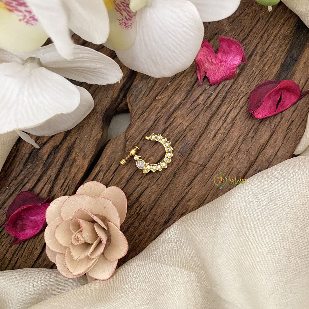 Introducing the Vriksham Bird Shape Golden Naths/Nose pin, designed for those who appreciate the beauty in craftsmanship. Handcrafted with intricate details and adorned with stunning white stones, this elegant piece adds a touch of sophistication to any outfit. Elevate your style with this exclusive accessory.