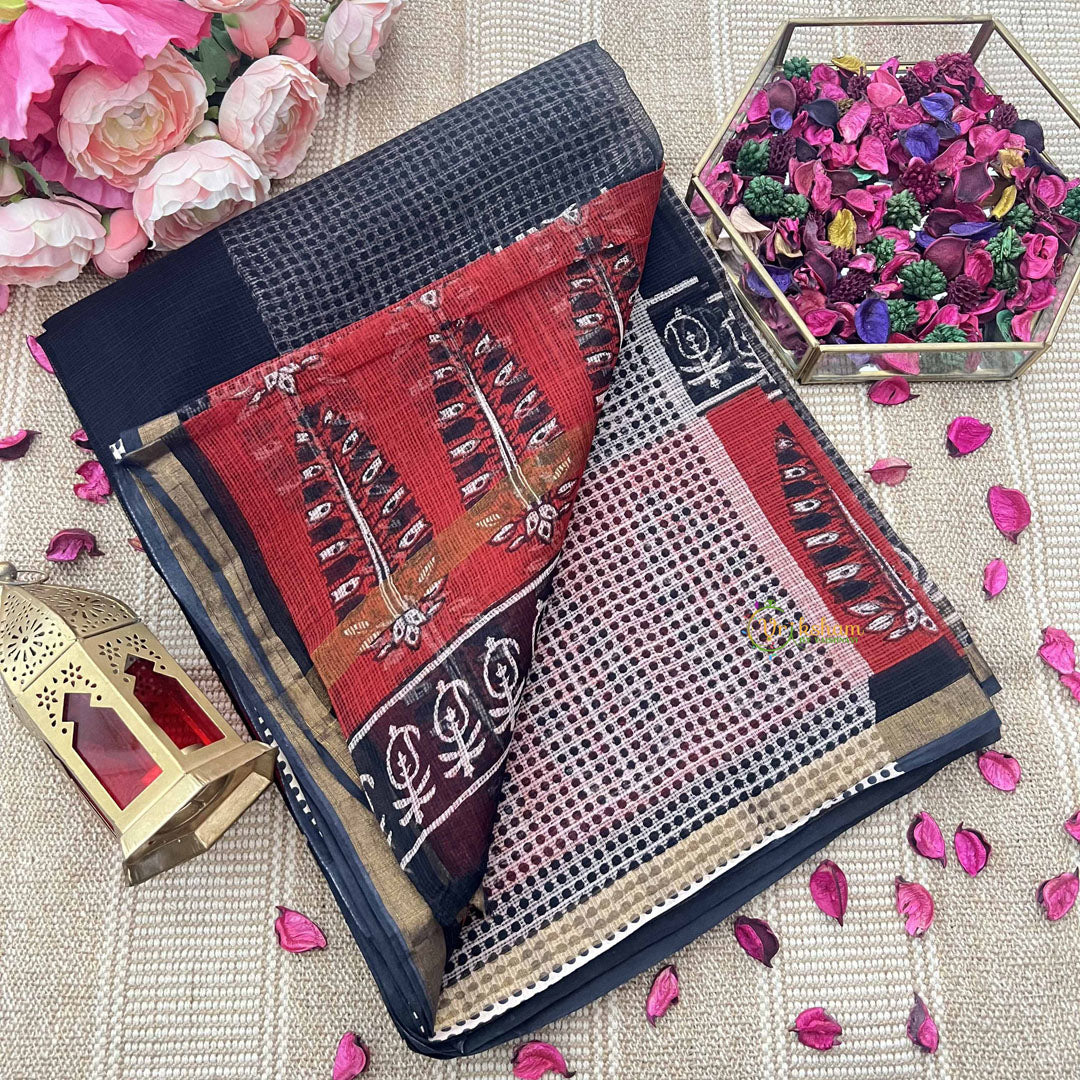 Experience understated luxury with this magnificent Kota cotton saree, where deep black meets rich red in perfect harmony, accented by an ornate golden border that exudes opulence. The striking color contrast creates a commanding presence, while the precious metallic detailing elevates the entire composition with regal sophistication. Constructed from premium Kota cotton, this saree offers superior comfort and a fluid drape that moves gracefully with every step. The breathable fabric ensures you remain cool and composed throughout extended wear, making it equally suitable for festive celebrations and formal occasions. The golden border serves as a stunning frame, drawing attention to the saree's impeccable craftsmanship and refined aesthetic. A statement piece that seamlessly blends traditional artistry with contemporary elegance, this saree is designed for those who appreciate quality, heritage, and timeless style.