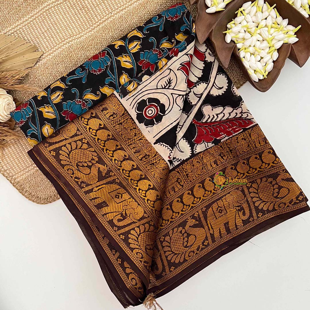 Embrace timeless sophistication with this authentic Kalamkari saree in striking black, featuring the revered Penumaka design that represents centuries of South Indian weaving tradition. Each motif is carefully hand-painted using traditional techniques, revealing the exceptional skill and cultural richness of genuine Kalamkari artistry. The warm brown Kanchi border adds earthy elegance, creating a refined contrast that enhances the overall composition. Perfect for formal gatherings, auspicious celebrations, and occasions demanding poised grace, this saree transcends seasonal trends. A distinguished addition to any refined wardrobe, it stands as a testament to India's textile heritage while offering the discerning wearer an heirloom-quality garment of unparalleled craftsmanship and enduring beauty.