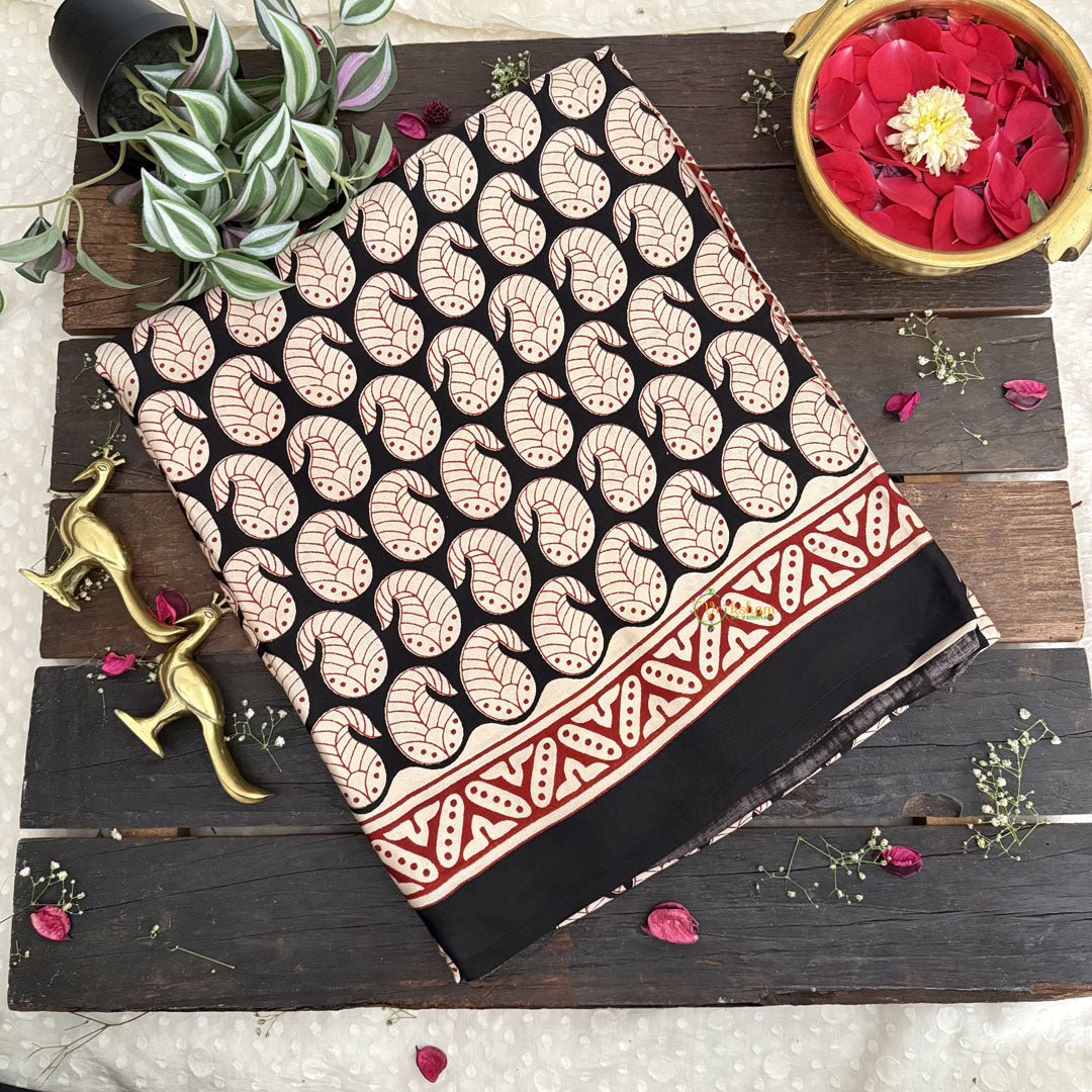 The Vriksham Black Designer Ajrakh Modal Silk Saree exudes timeless sophistication with its deep black hue and intricate Ajrakh patterns. Crafted from smooth modal silk, this saree offers a graceful drape and comfortable wear, making it an ideal choice for elegant occasions. Its classic design and fine craftsmanship create a striking statement of refined style.