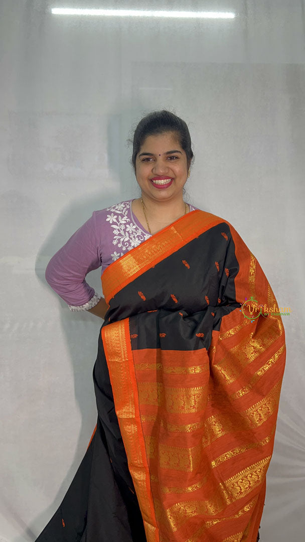 Command attention with this striking Kalyani cotton saree, presenting a dramatic black body adorned with a vibrant orange border and exquisite golden butta detailing. Constructed from premium Kalyani cotton, the fabric offers exceptional breathability and comfort, ideal for all-day sophistication and warm weather wear. The bold contrast between deep black and vivid orange, enhanced by shimmering golden accents, creates a powerful yet refined aesthetic perfect for weddings, celebrations, and formal events. The intricate golden butta design reflects meticulous artisanal craftsmanship and authentic Indian weaving heritage. Natural Kalyani cotton ensures superior drape, exceptional durability, and effortless maintenance. This commanding piece appeals to the confident, style-conscious wearer who appreciates dramatic elegance, cultural authenticity, and timeless craftsmanship—a versatile investment that makes an unforgettable statement.