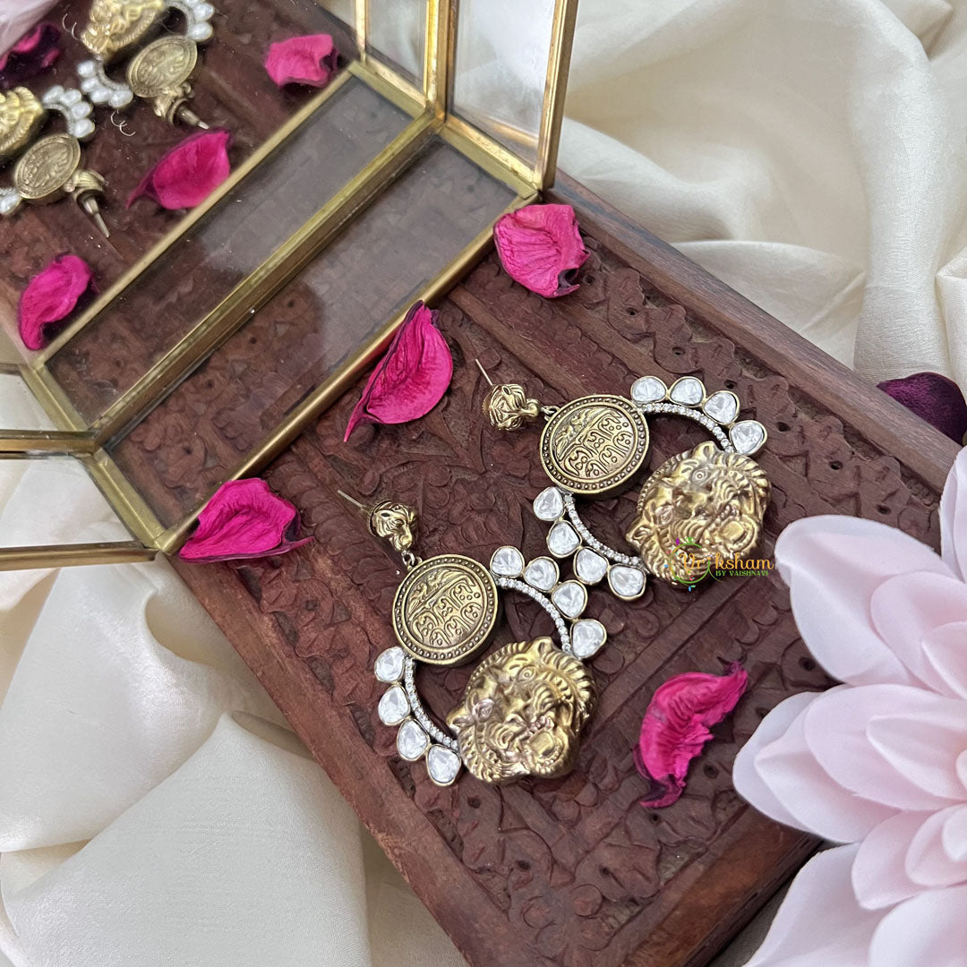 Inspired by Sabyasachi's iconic aesthetic, these Tiger Face earrings embody artistic refinement with their exquisite gold polish finish. The commanding feline motif, meticulously detailed and adorned with luminous Moissanite stones, creates a captivating interplay of light and texture. These statement pieces offer a sophisticated homage to heritage craftsmanship while delivering contemporary elegance—perfect for the discerning individual who appreciates cultural artistry with modern sensibility.