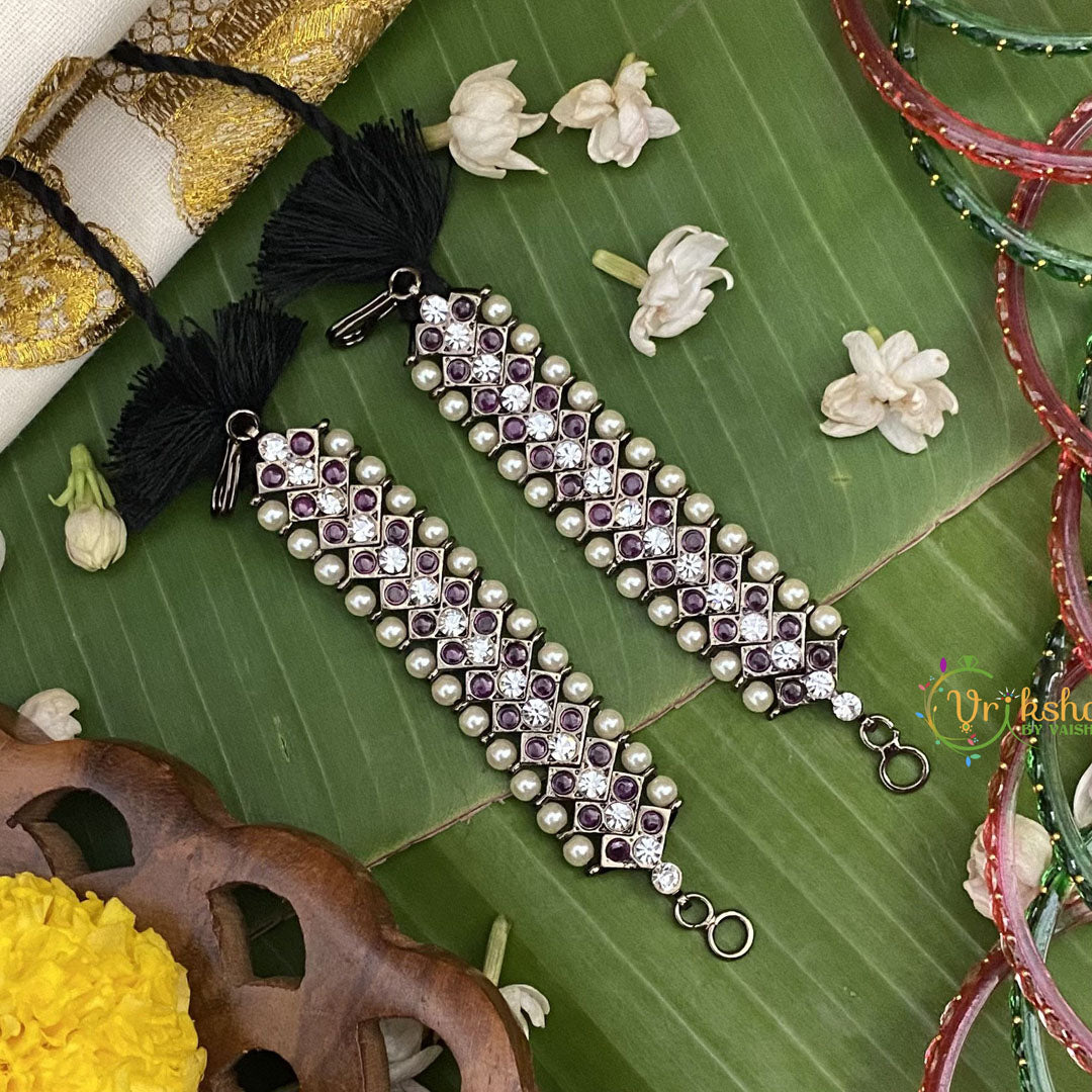 Elevate your style with Vriksham Black Polish Traditional Precious Kemp Maatil. This luxurious piece adds a touch of heritage and opulence to any outfit. The intricate kemp stones and traditional black polish showcase the rich craftsmanship and legacy of Indian culture. Exude elegance and exclusivity with this must-have adornment.