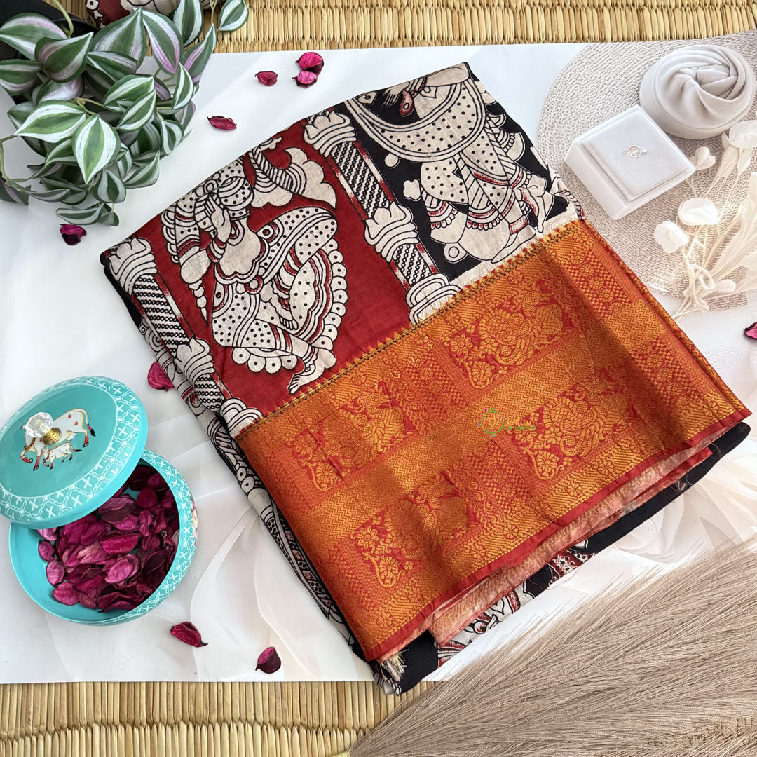 Vriksham Black & Radish Red Kalamkari Saree With Kanchi Border-VS4682