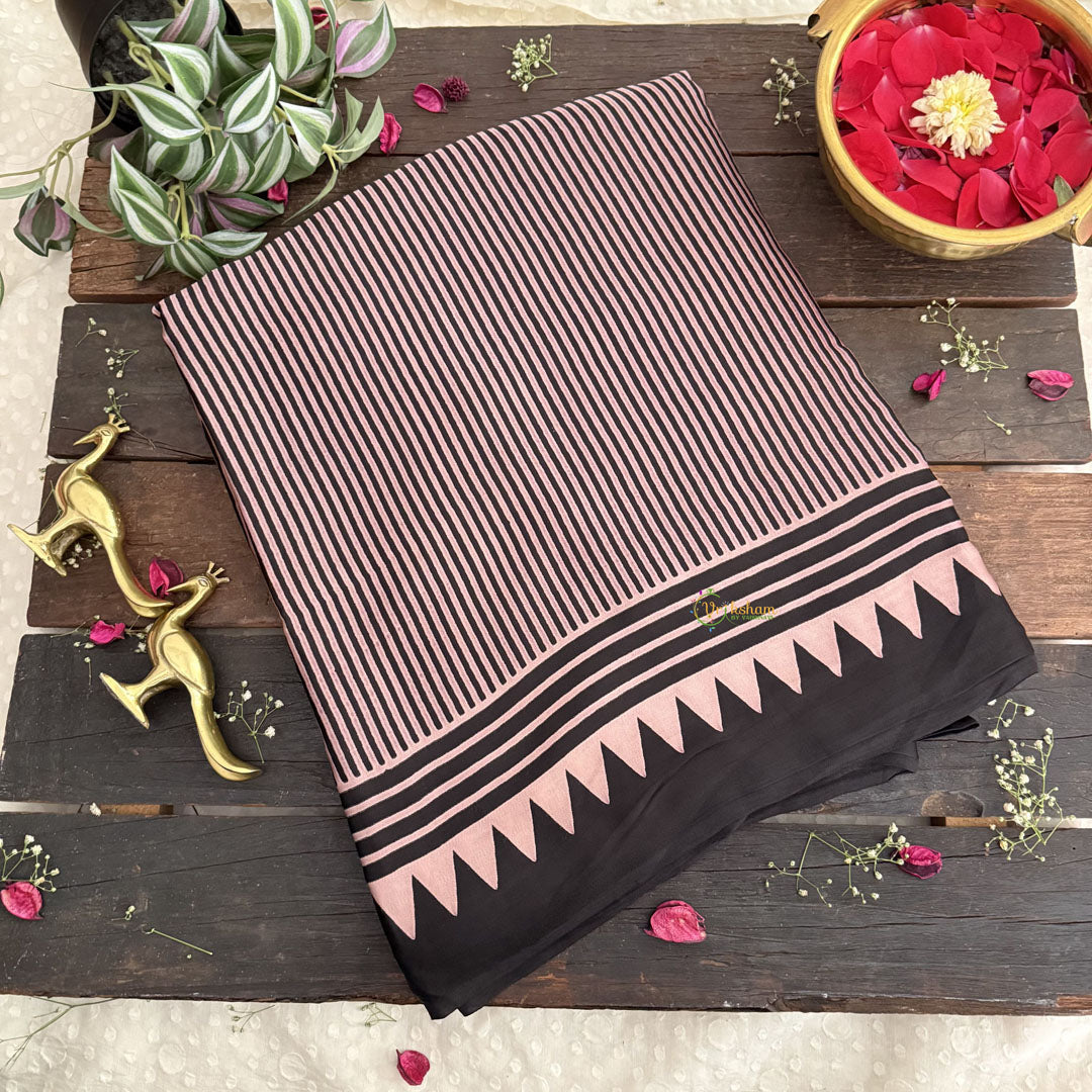 The Vriksham Black & Shade of Pink Striped Print Ajrakh Modal Silk Saree showcases a harmonious blend of deep black and soft pink stripes, crafted with traditional Ajrakh techniques on luxurious modal silk. Its smooth texture and elegant drape make it an ideal choice for refined occasions, offering a sophisticated and timeless appeal.