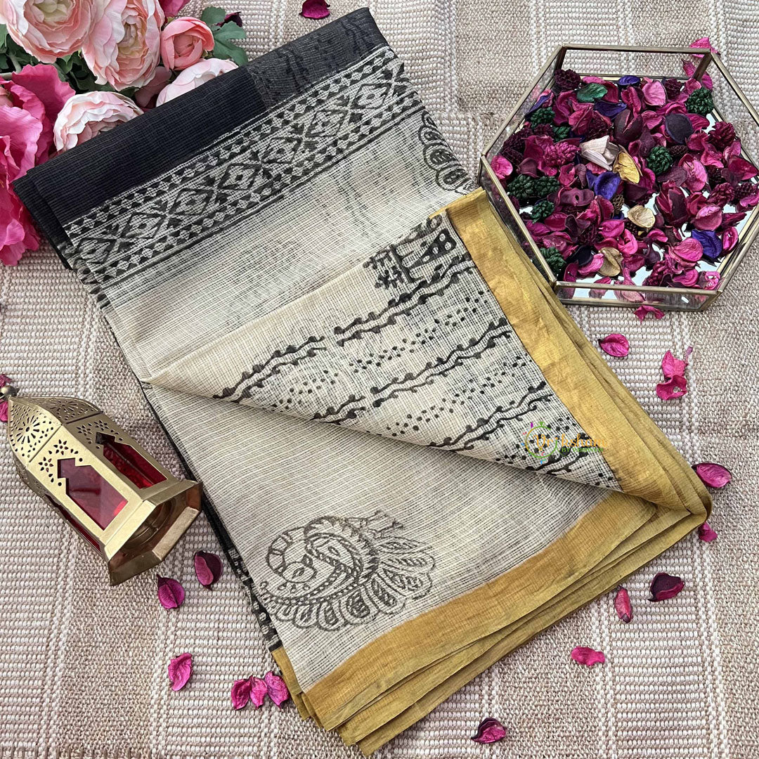Embrace regal elegance with this magnificent Kota cotton saree, showcasing exquisite black and white peacock prints that symbolize grace and timeless beauty, crowned with a radiant yellow border. The majestic peacock motifs create a focal point of artistic excellence, while the monochromatic palette provides a refined backdrop that enhances the design's intricate details. Woven from premium Kota cotton, this saree offers superior breathability and a naturally elegant drape that moves with effortless poise. The lightweight fabric ensures exceptional comfort throughout extended wear, making it perfect for celebrations, formal occasions, and cultural events. The luminous yellow border frames the peacock design beautifully, adding warmth and visual impact to the composition. The meticulous craftsmanship and symbolic peacock imagery appeal to those who appreciate heritage artistry and meaningful design. Perfect for discerning wearers who value quality, tradition, and sophisticated aesthetics, this saree seamlessly transitions from festive gatherings to contemporary settings. An investment piece that celebrates timeless elegance and enduring style