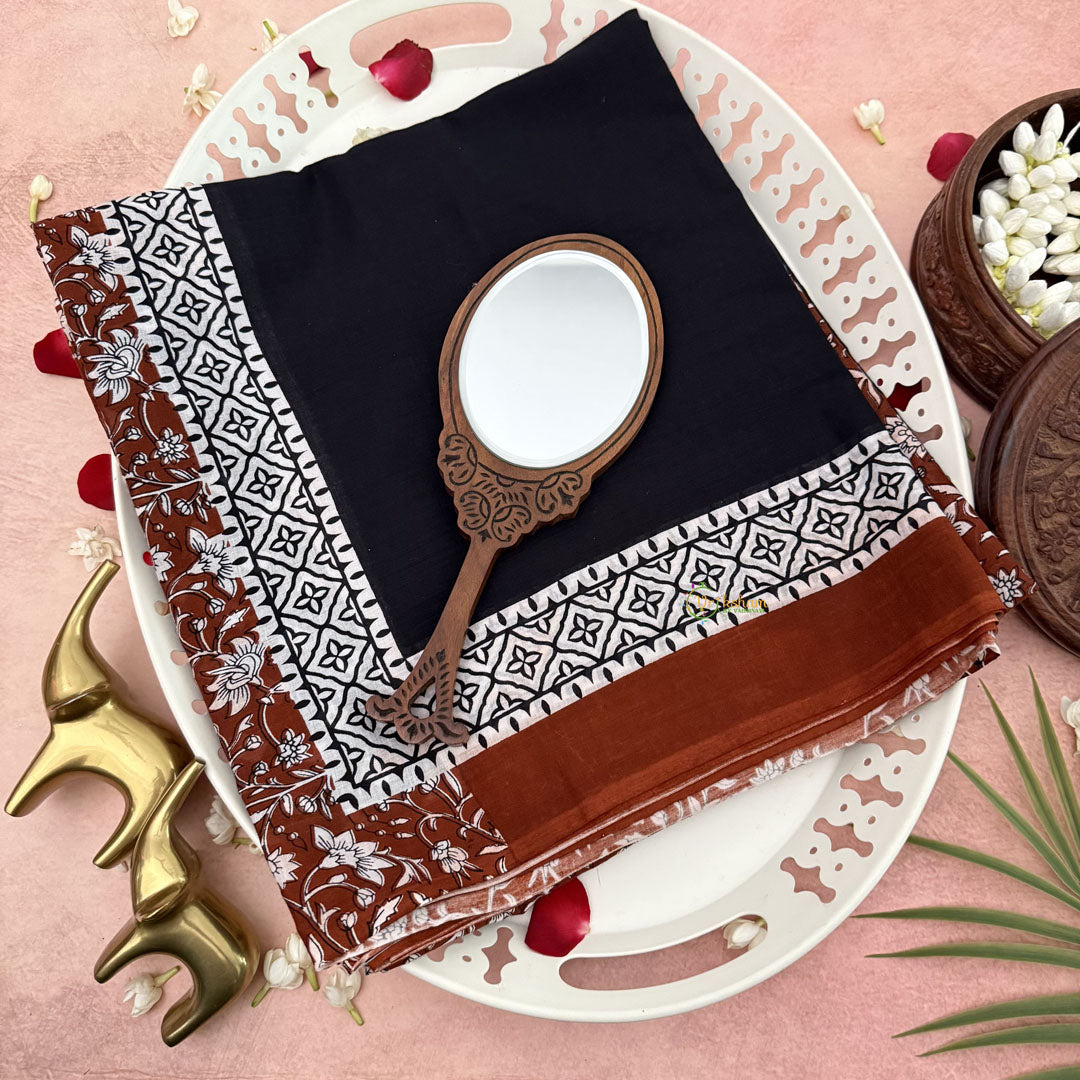 The Vriksham Black Cotton Mulmul Saree features a graceful half brown floral print that adds a touch of delicate charm. Made from soft, breathable mulmul cotton, it ensures all-day comfort while exuding refined elegance. This saree is an ideal choice for those seeking a sophisticated blend of classic design and subtle artistry.