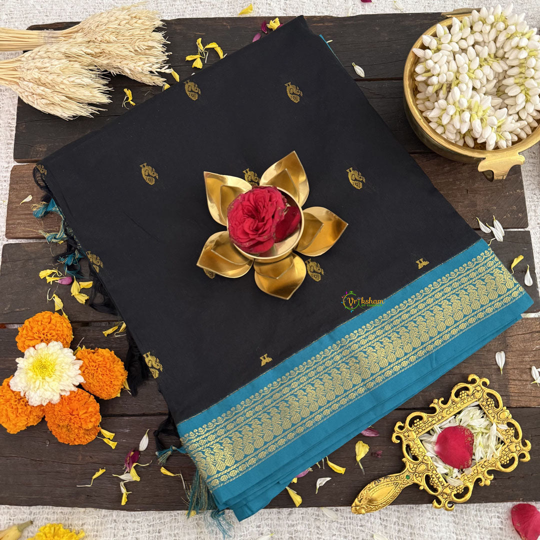 The Vriksham Black Kalyani Cotton Saree, accented with a striking teal blue border, offers a perfect blend of classic elegance and contemporary style. Crafted from soft, breathable cotton, it ensures all-day comfort while making a bold statement. This saree is an ideal choice for formal occasions or stylish everyday wear, embodying sophistication with every drape.