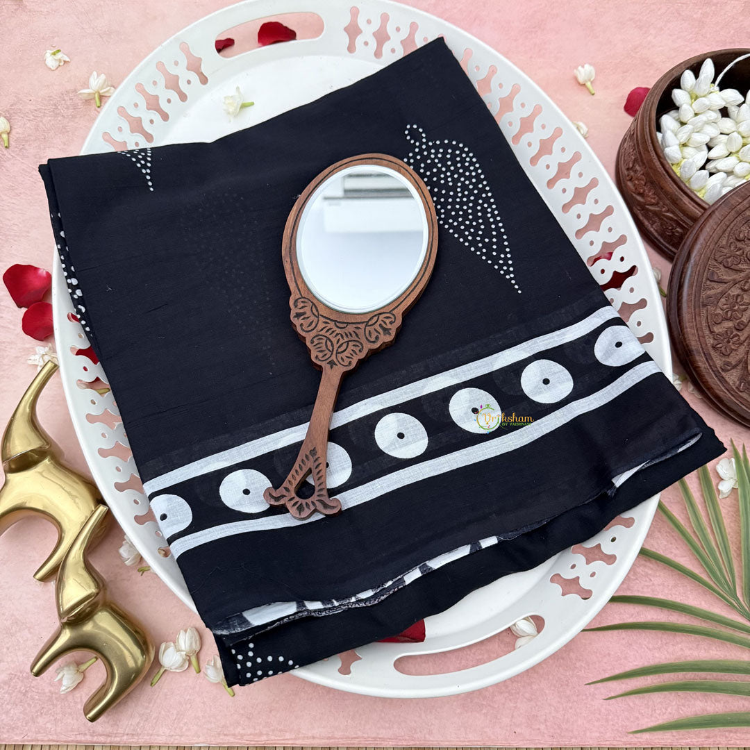 The Vriksham Black With White Printed Cotton Mulmul Saree blends classic contrast with breathable comfort. Crafted from soft mulmul cotton, its elegant black base is beautifully accented by delicate white prints, creating a refined look suitable for both formal and casual settings. This saree offers a graceful drape and timeless appeal, perfect for those who appreciate subtle sophistication.